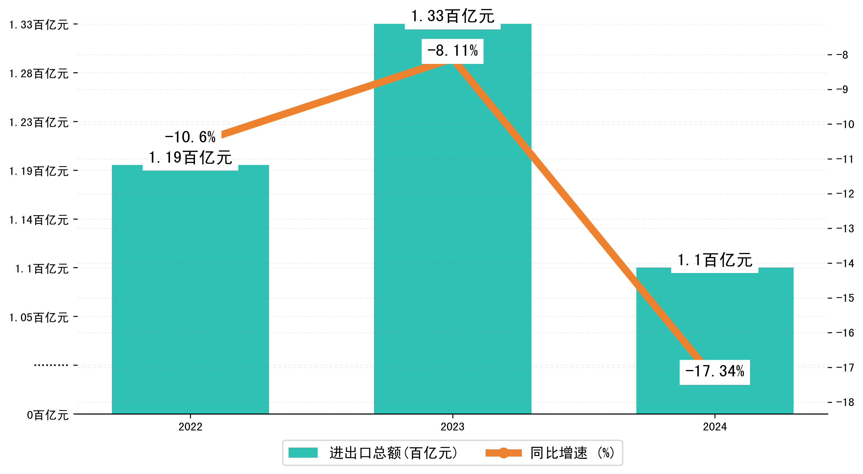 以人民币计,2024年1-3月营口市进出口总额为109,5236.22万元,相比上年同期减少了22,9804.5345万元,同比减少了-14.30%。