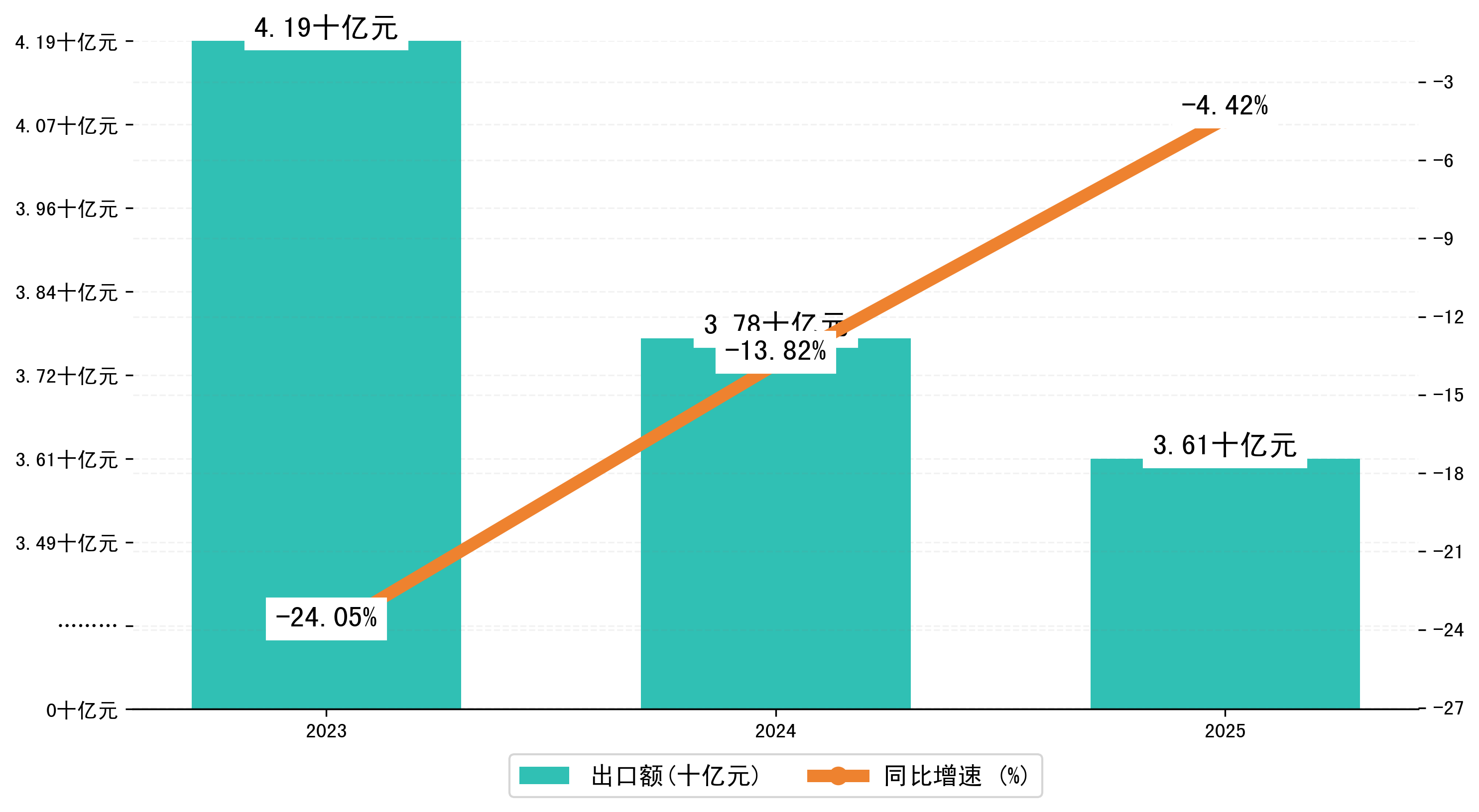 以人民币计,2025年1-2月营口市出口额为36,0833.9098万元,相比上年同期减少了1,6671.1415万元,同比减少了-4.00%。
