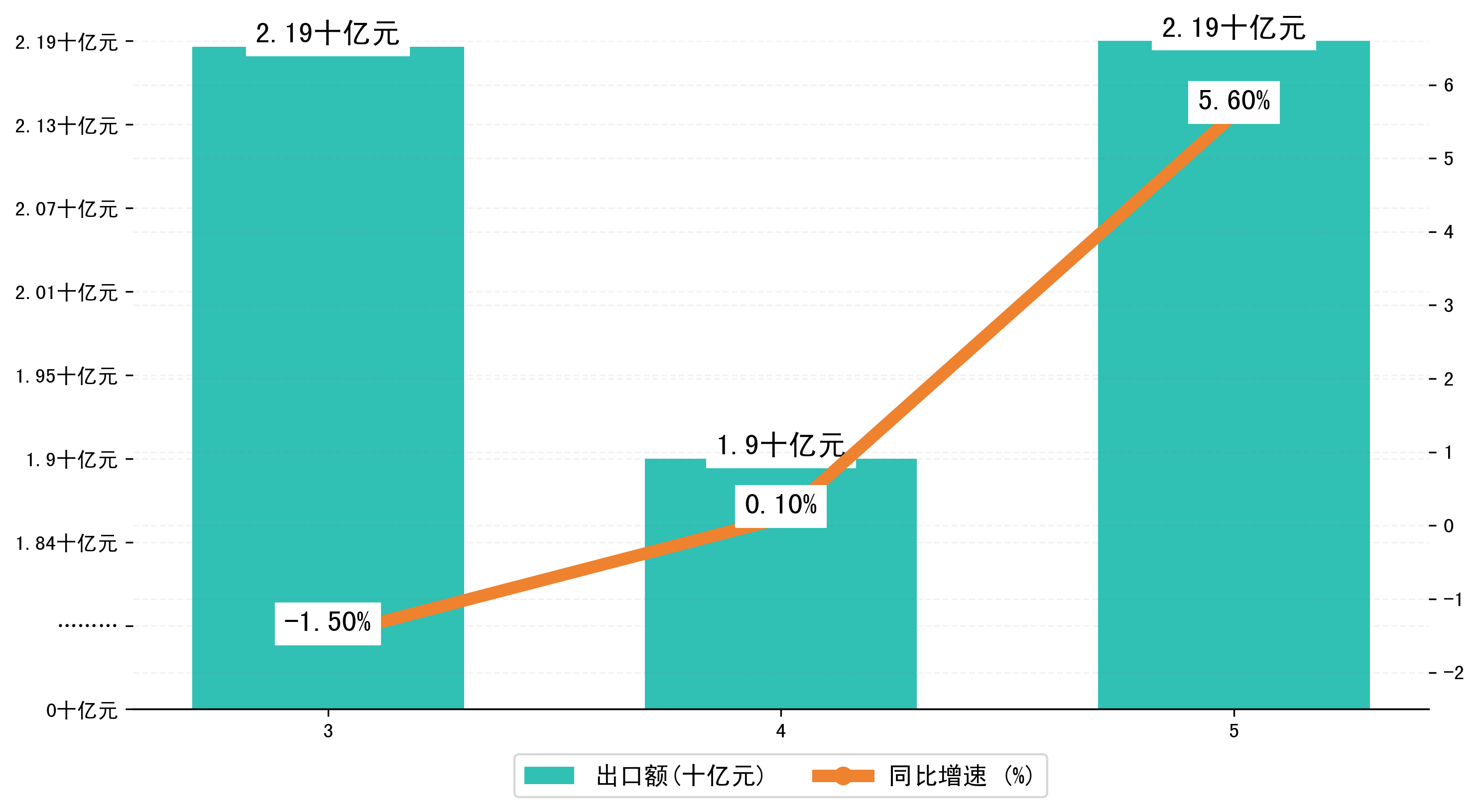 以美元计,2025年1-5月营口市出口额为13,7429.4083万美元,相比上年同期增加了5895.062万美元,同比增加4.50%。