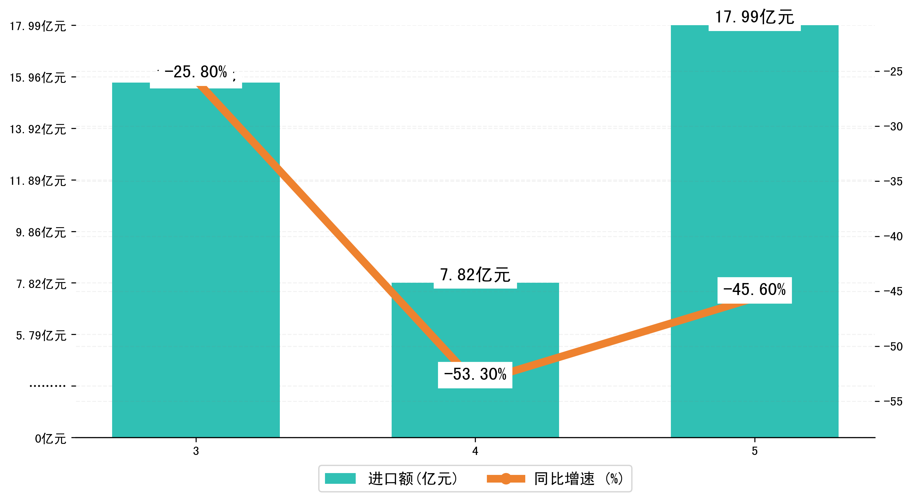 以美元计,2025年5月营口市进口额为2,5036.5707万美元,相比上月增加了1,4134.4959万美元;相比上年同期减少了2244.6256万美元,同比减少-46.20%。