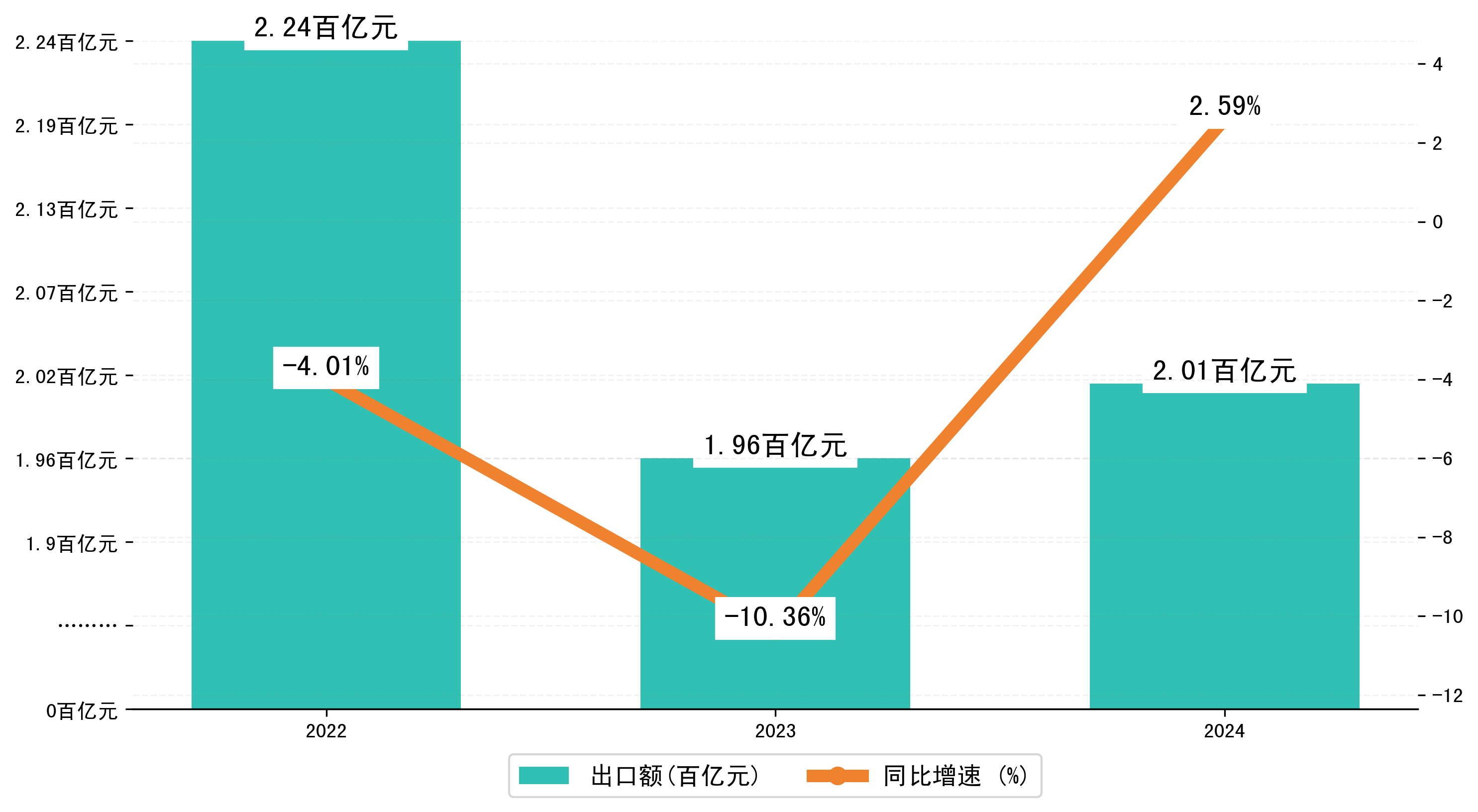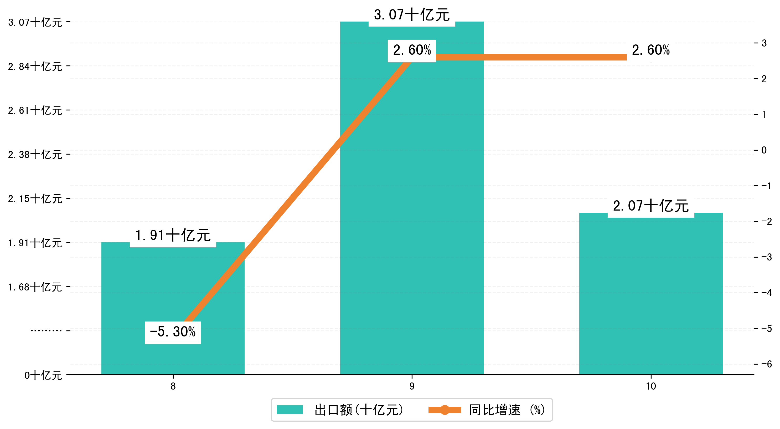 以人民币计,2024年1-10月营口市出口额为201,1525.3201万元,相比上年同期增加了5,0711.5483万元,同比增加了2.60%。