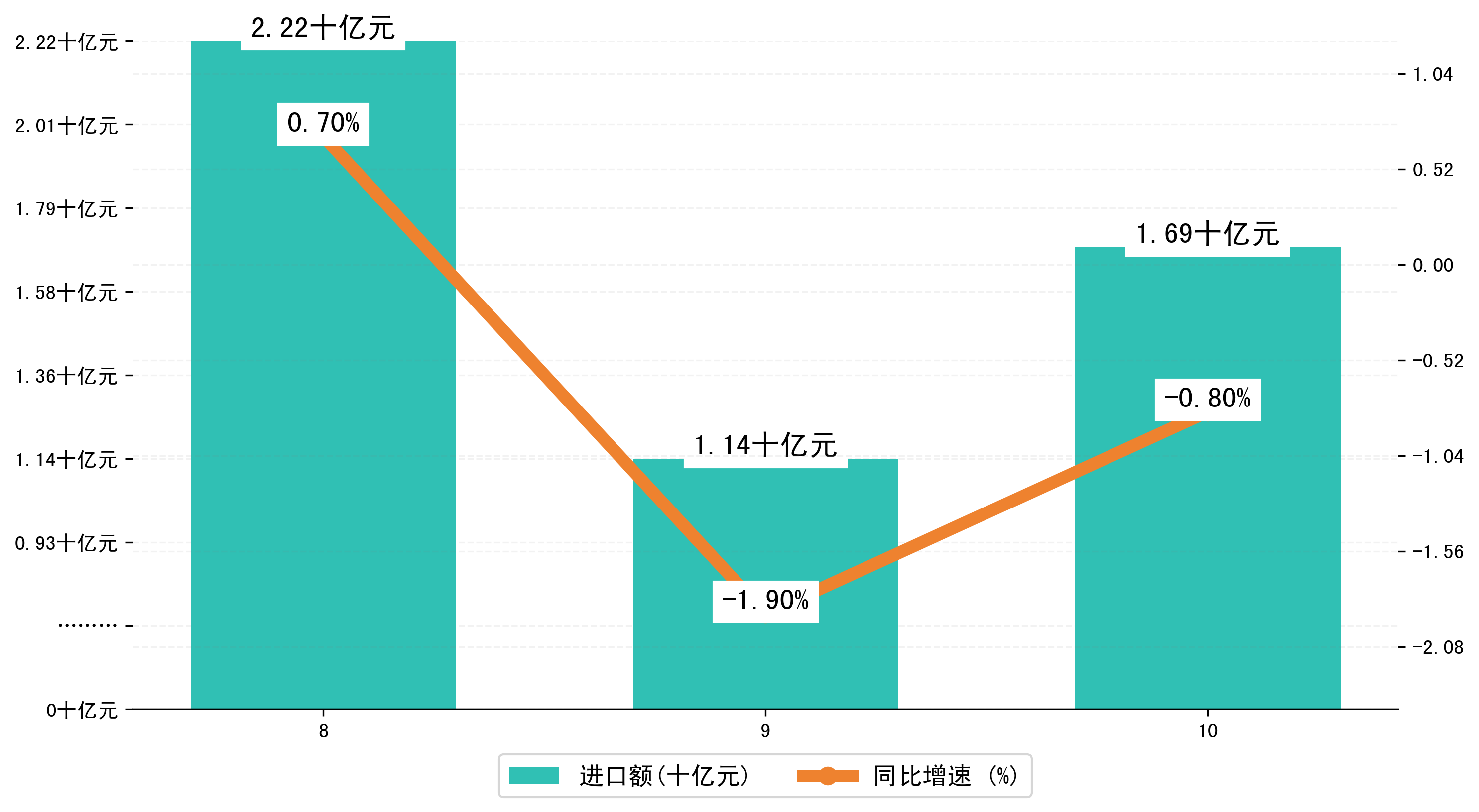 以人民币计,2024年10月营口市进口额为16,9013.8439万元,相比上月增加了5,4589.9069万元;相比上年同期增加了2,0845.7274万元,同比减少了-0.80%。