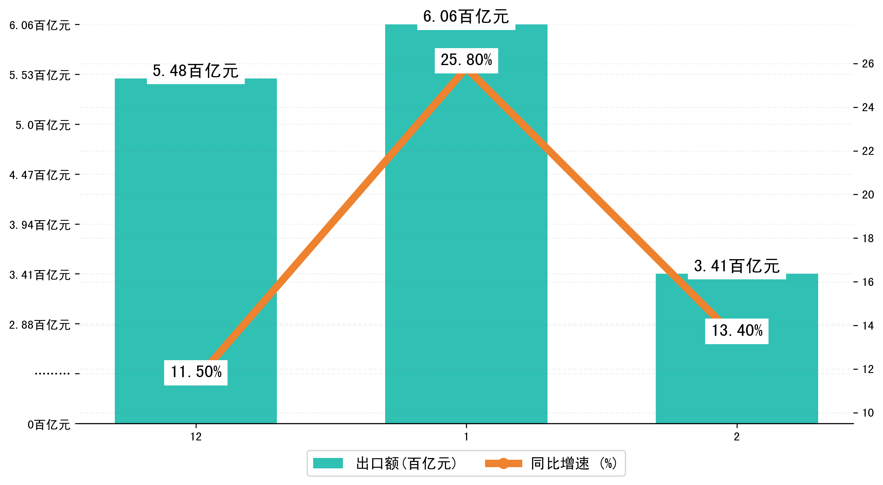 一、2025年2月杭州市单月出口总额及进出口差额统计分析