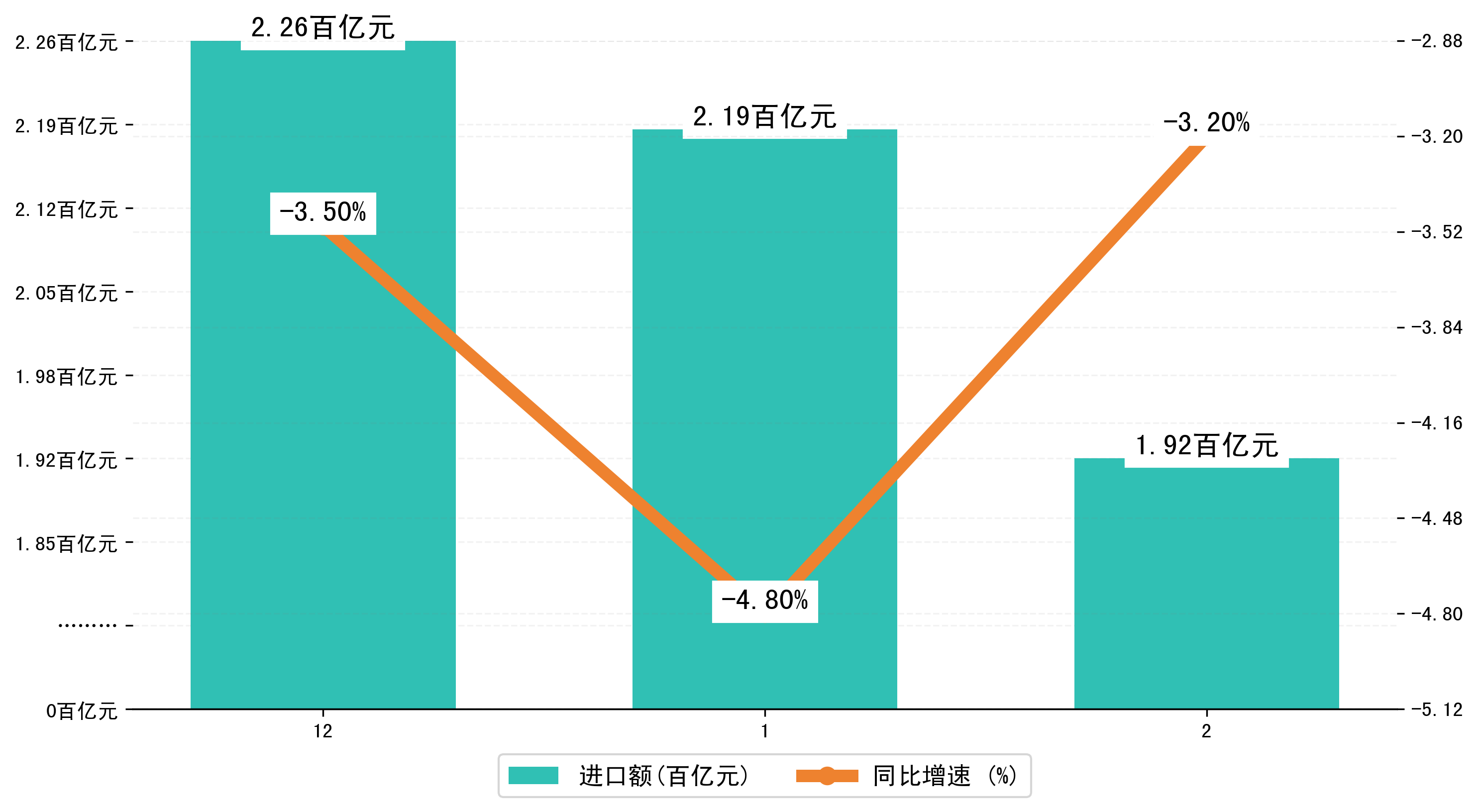 以人民币计,2025年1-2月杭州市进口额为410,2459.074万元,相比上年同期减少了13,5322.8805万元,同比减少了-3.20%。