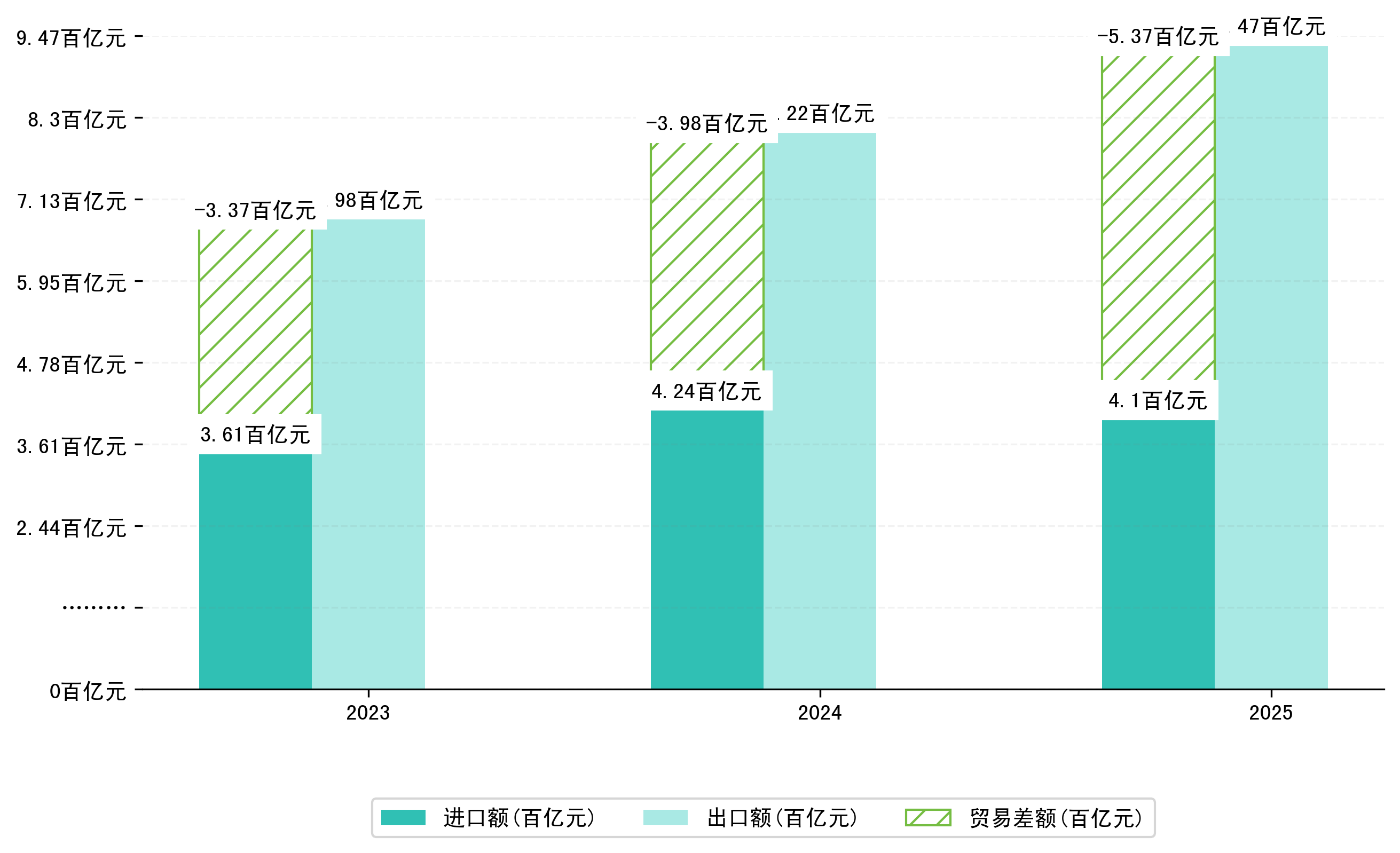 以人民币计,2025年1-2月杭州市贸易差额为536,7072,3577万元(贸易顺差),相比上年同期增加了138,2847,1142万元,同比增加34.71%。