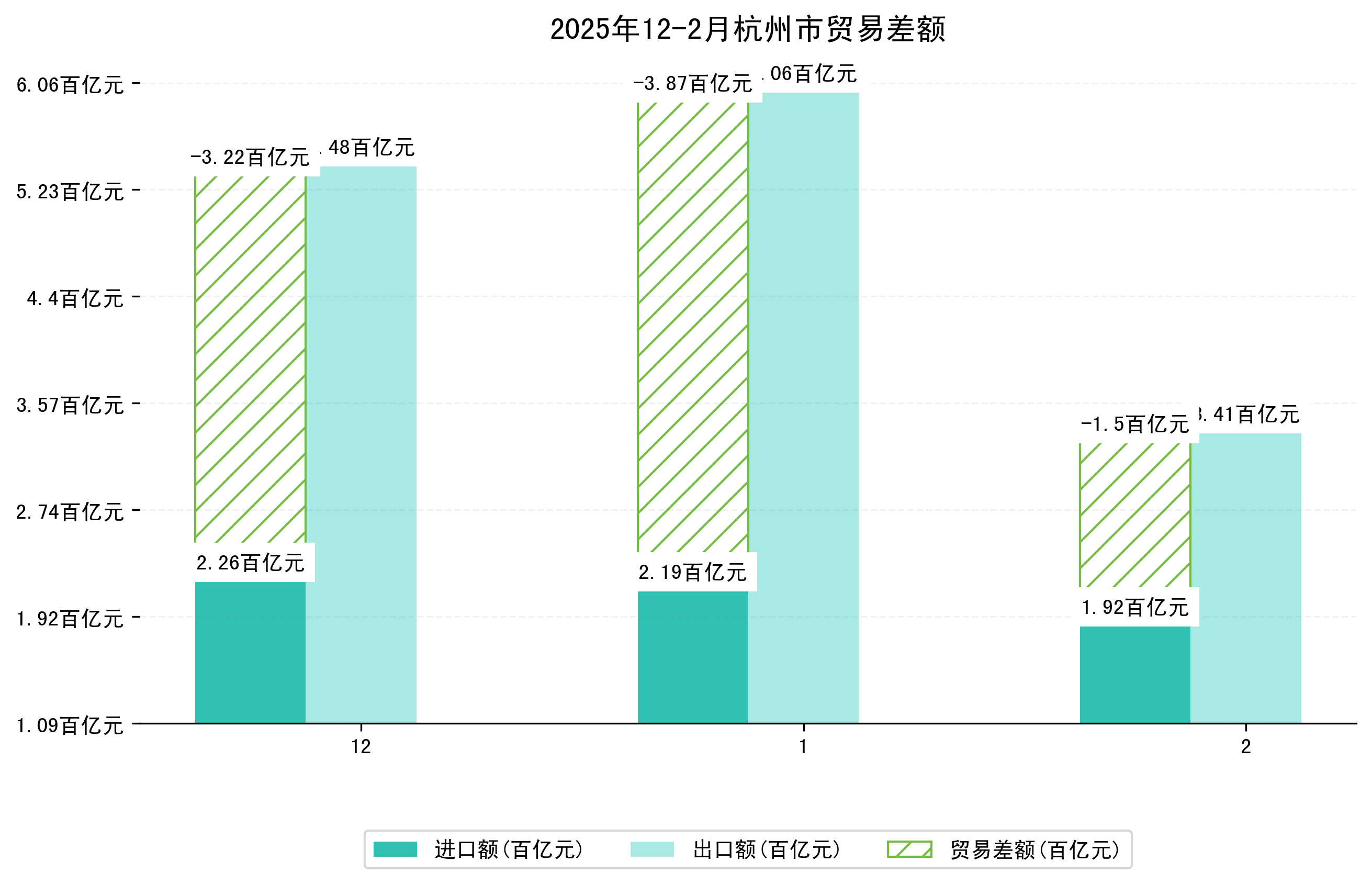 2025年2月杭州市进出口总额及进出口差额统计分析