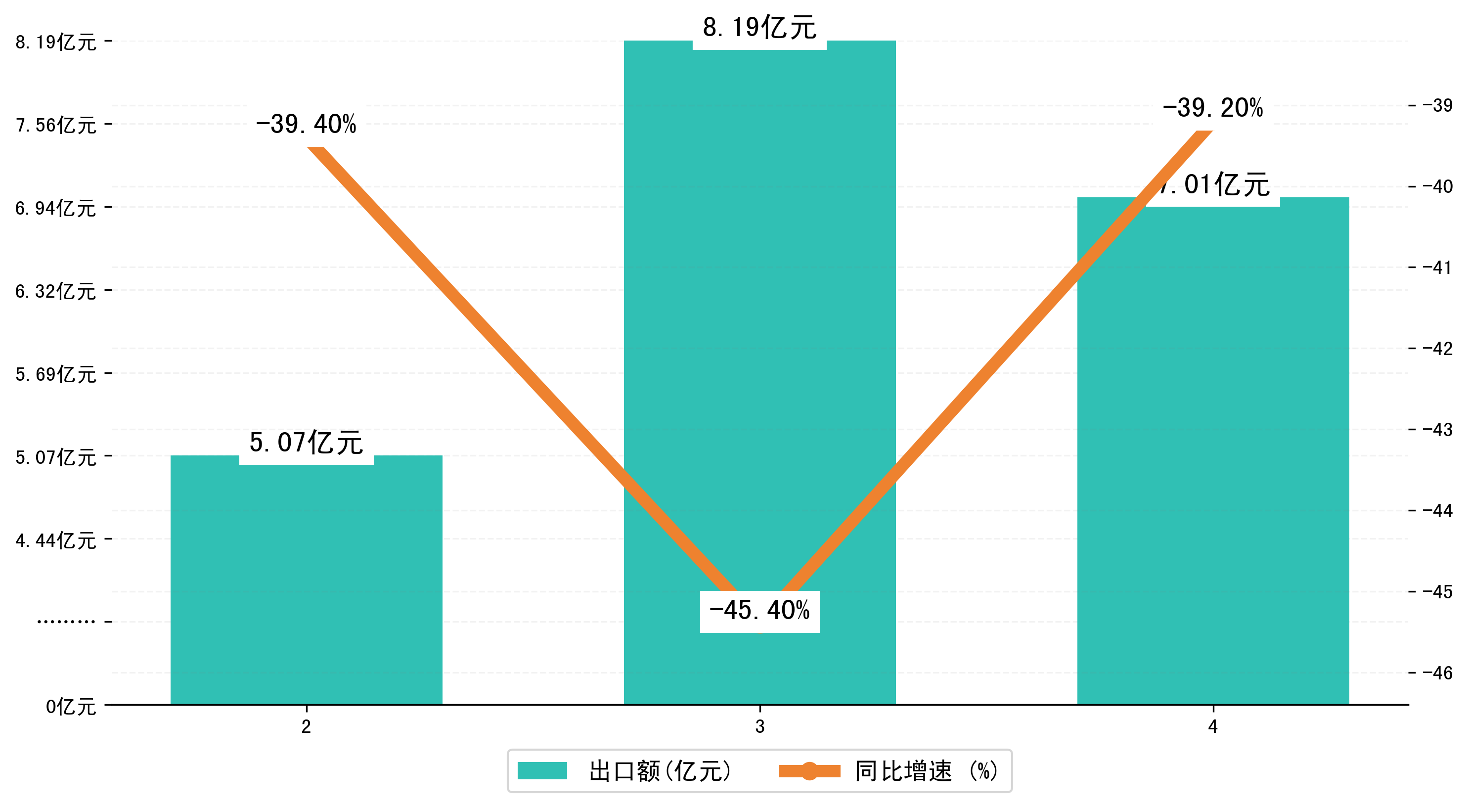 以美元计,2024年1-4月鹰潭市出口额为3,8538.0662万美元,相比上年同期减少了3,1033.6126万美元,同比减少-41.20%。