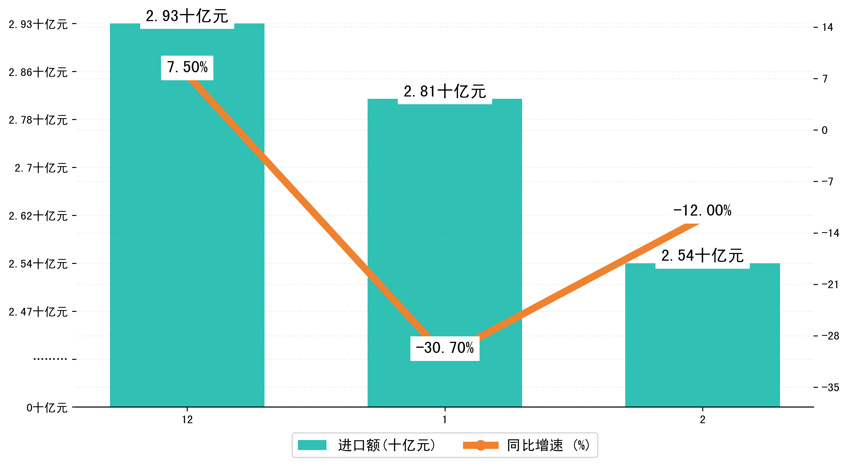 以人民币计,2024年2月鹰潭市进口额为25,4331.9203万元,相比上月减少了2,6831.692万元;相比上年同期增加了5,7469.925万元,同比减少了-12.00%。
