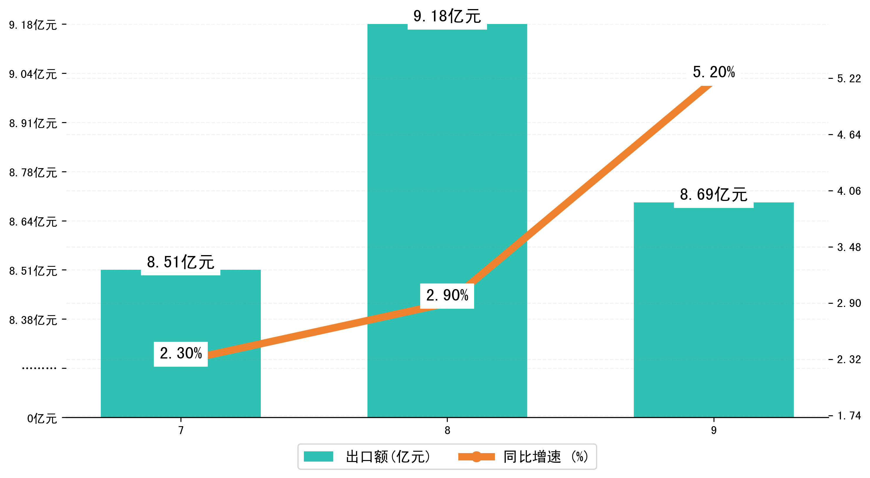 以美元计,2024年1-9月鹰潭市出口额为12,3435.2831万美元,相比上年同期增加了3504.2716万美元,同比增加2.90%。