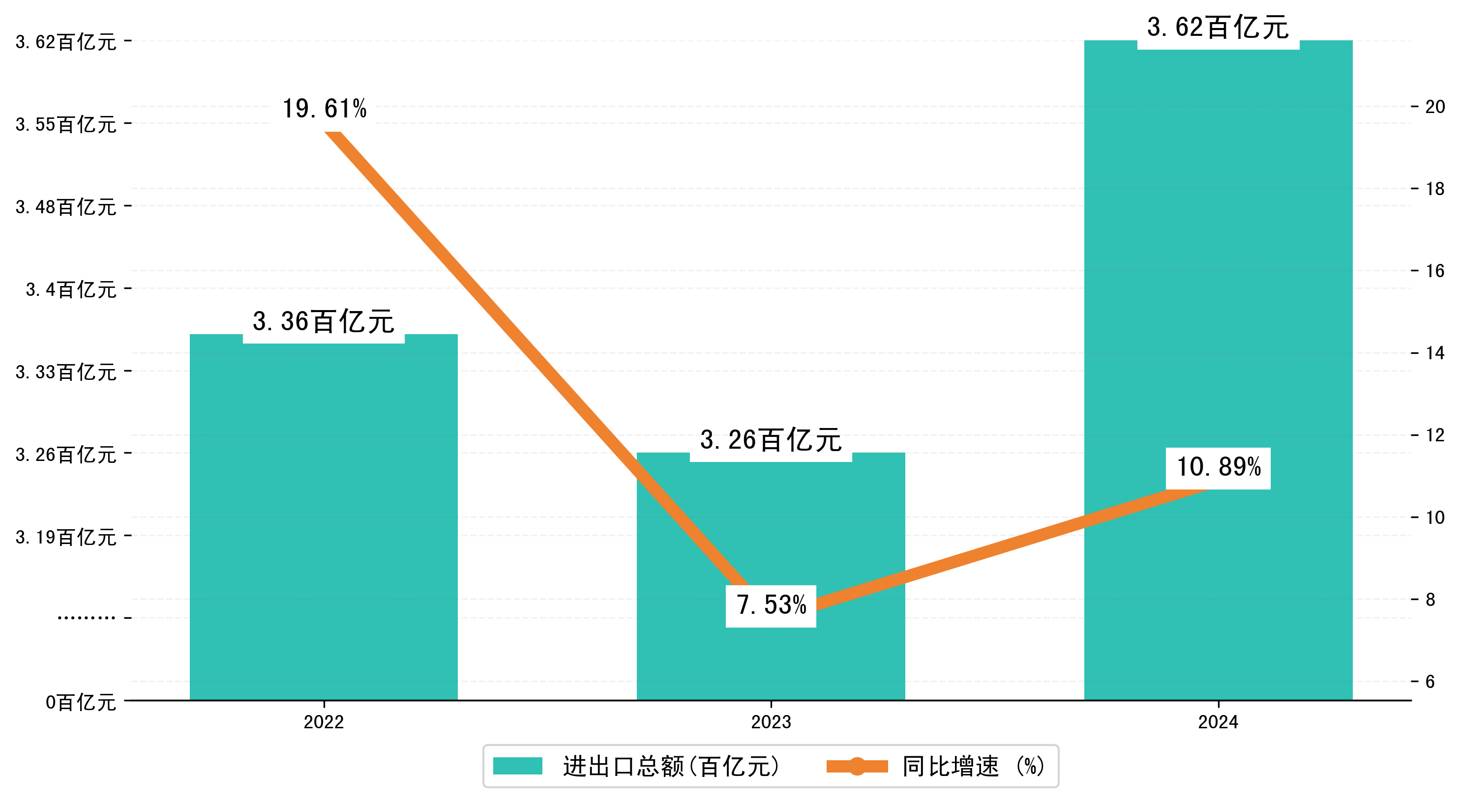 以人民币计,2024年1-9月鹰潭市进出口总额为361,7324.0168万元,相比上年同期增加了35,5357.7806万元,同比增加了12.00%。