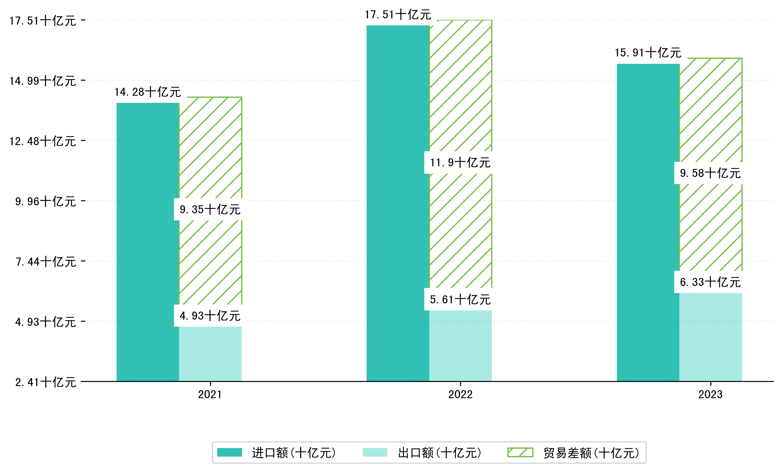 以人民币计,2023年6月鹰潭市贸易差额为11,2507,9118万元(贸易逆差),相比上月增加了4,6063,1814万元,即6949,1297万美元;相比上年同期增加了8,2215,4451万元,同比增加-42.22%。