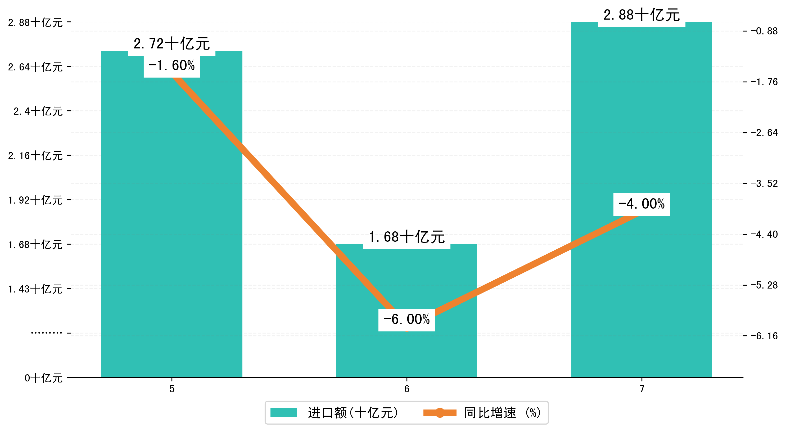 以人民币计,2023年1-7月鹰潭市进口额为187,8970.7832万元,相比上年同期减少了17,1307.9311万元,同比减少了-4.00%。