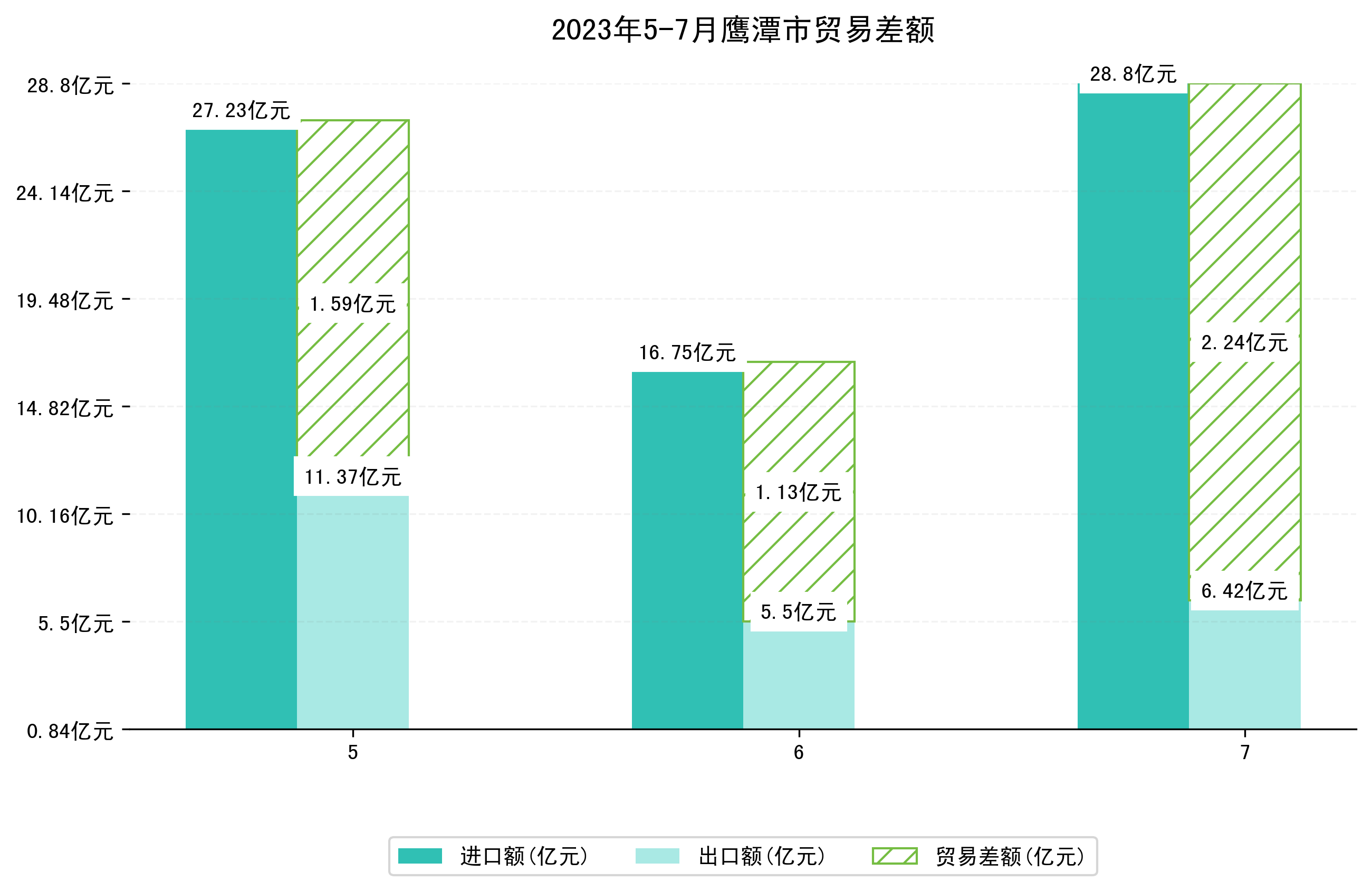 以人民币计,2023年7月鹰潭市贸易差额为22,3809,4951万元(贸易逆差),相比上月减少了11,1301,5833万元,即1,5321,2042万美元;相比上年同期减少了2,6424,3180万元,同比减少13.39%。
