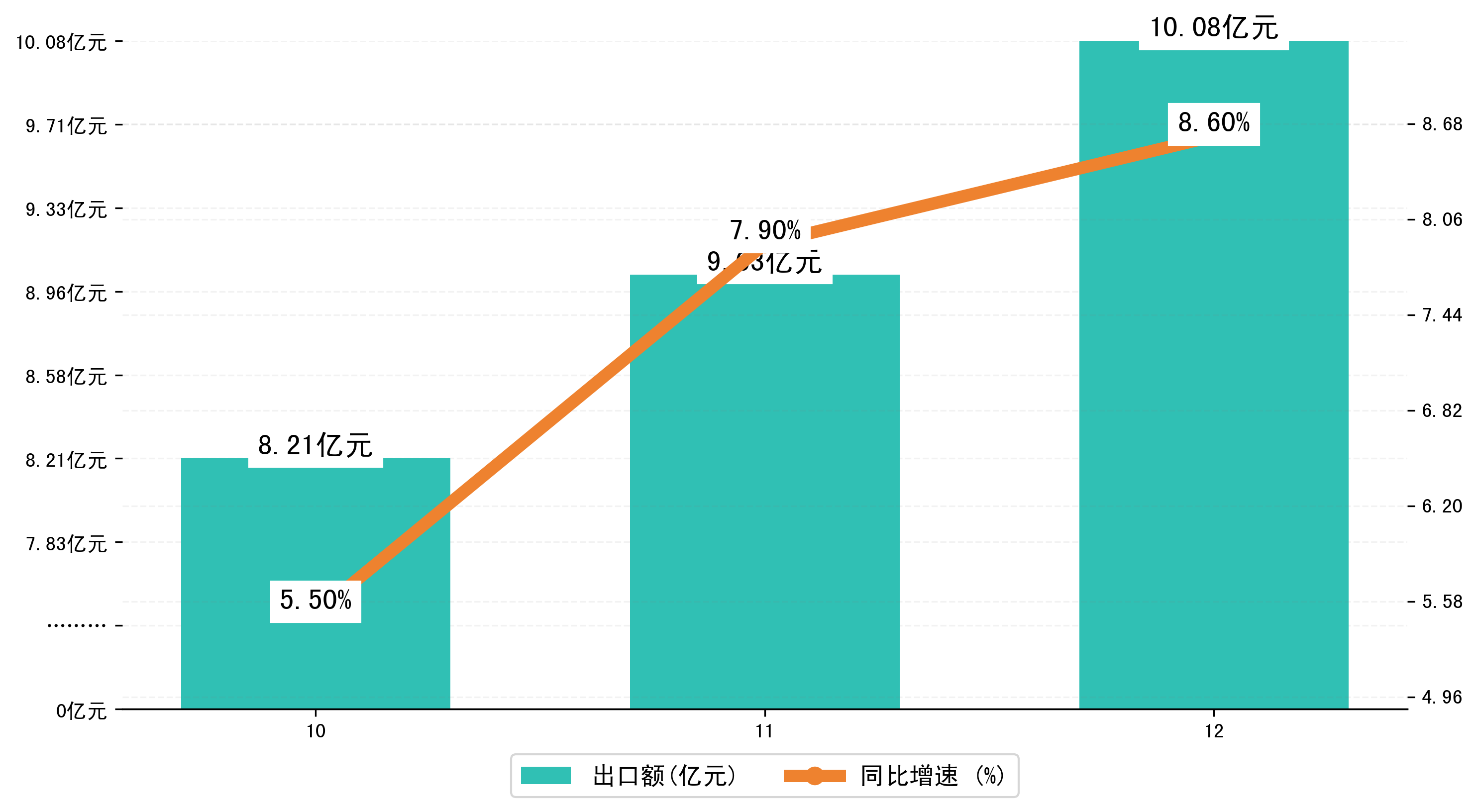 以人民币计,2024年1-12月鹰潭市出口额为115,0663.5892万元,相比上年同期增加了9,1171.5195万元,同比增加了8.60%。