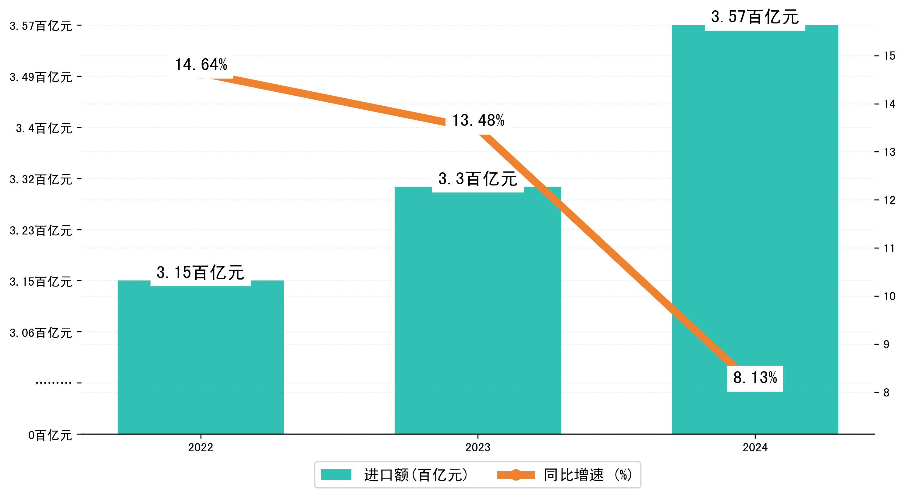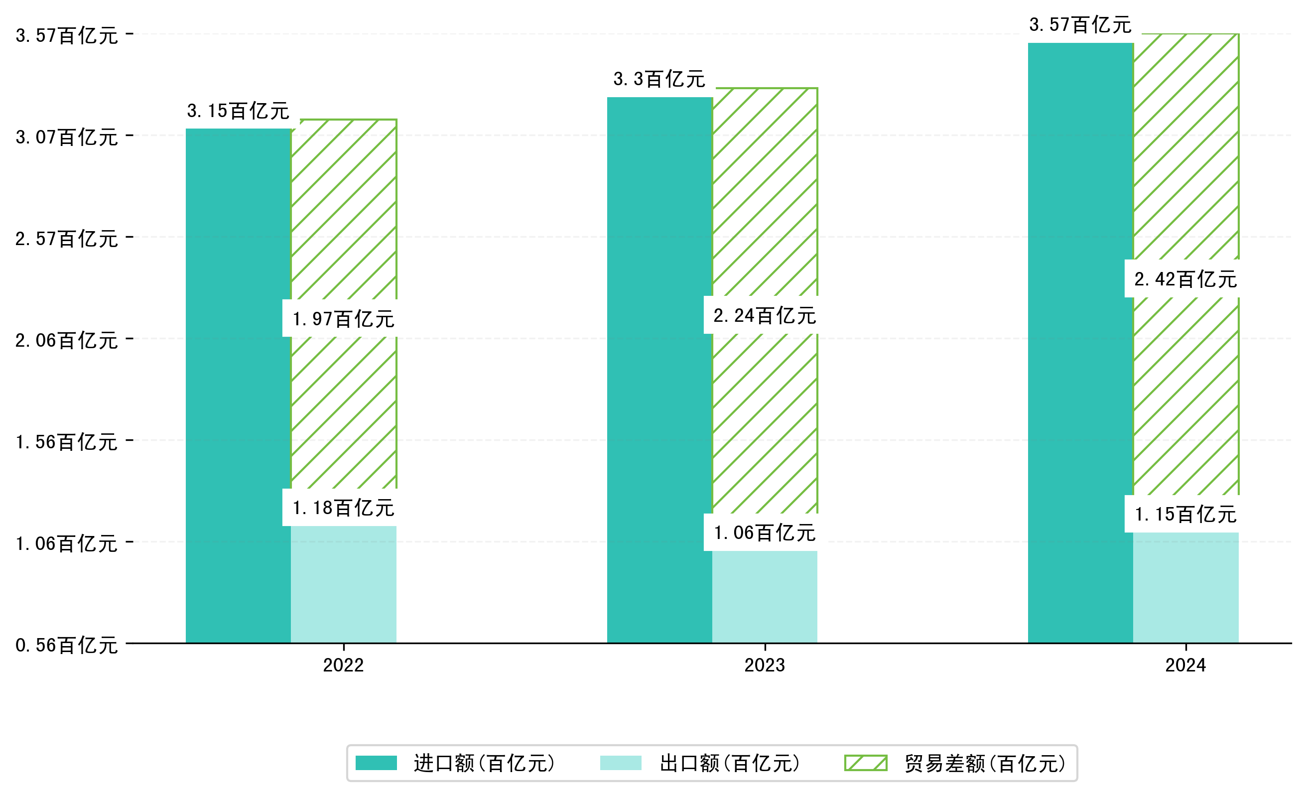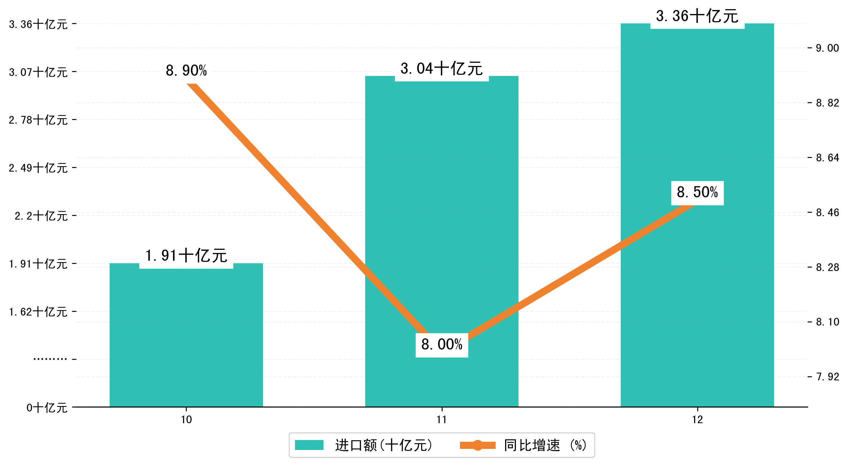 以人民币计,2024年1-12月鹰潭市进口额为357,2597.404万元,相比上年同期增加了26,8733.5959万元,同比增加了8.50%。