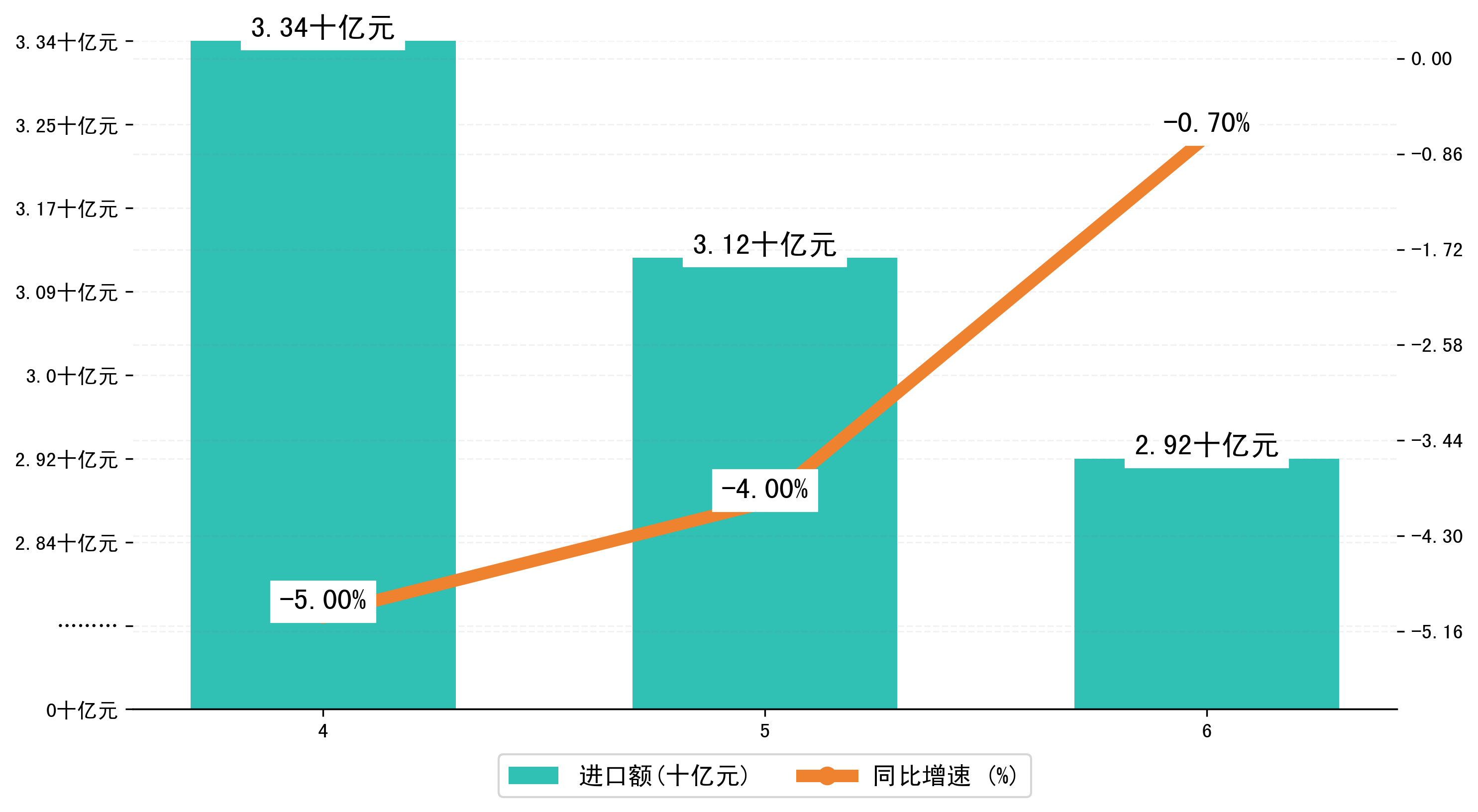 以人民币计,2025年6月鹰潭市进口额为29,2036.4274万元,相比上月减少了2,0027.654万元;相比上年同期增加了5,5379.383万元,同比减少了-0.70%。