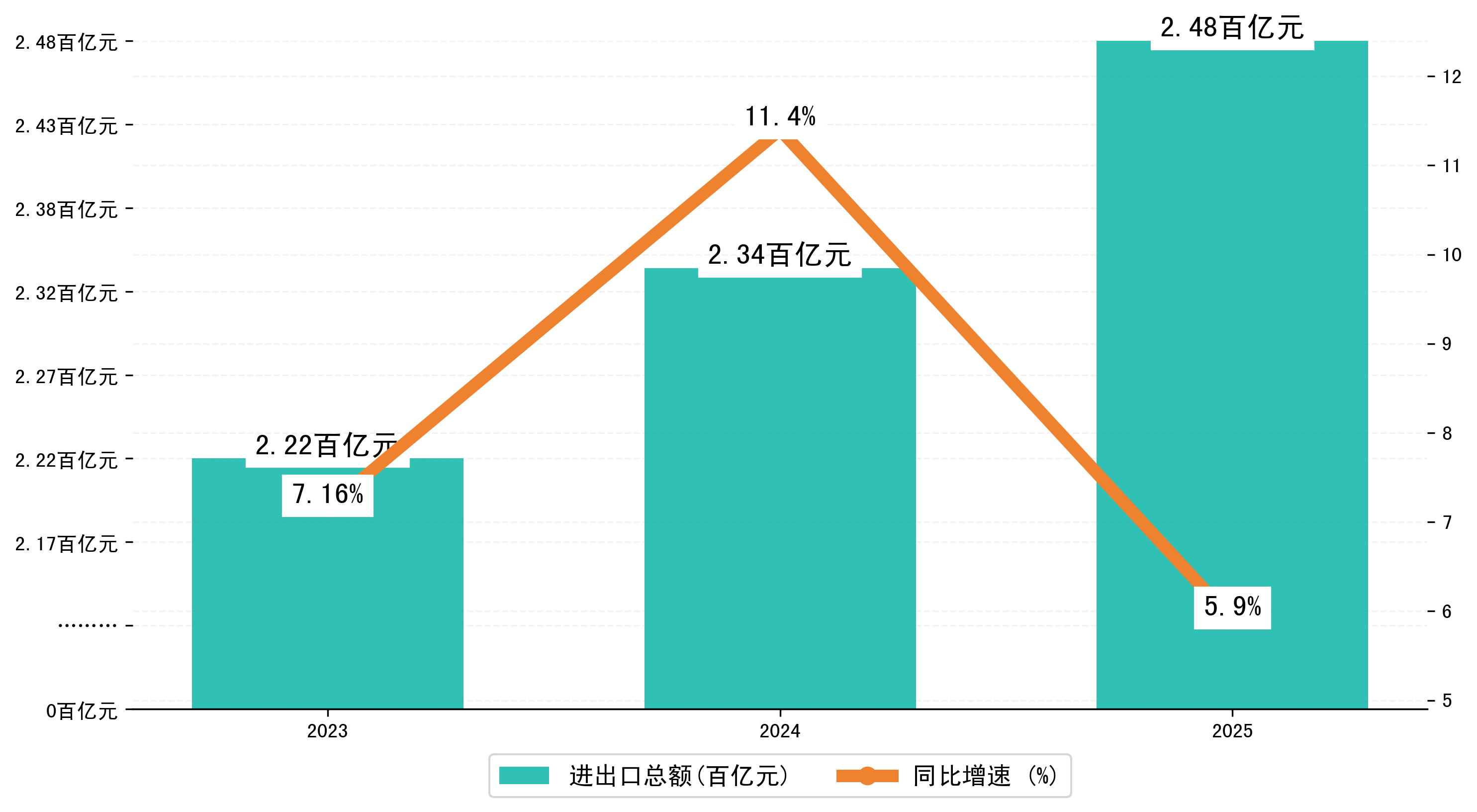 以人民币计,2025年1-6月鹰潭市进出口总额为247,7037.9904万元,相比上年同期增加了13,7904.3049万元,同比增加了2.60%。