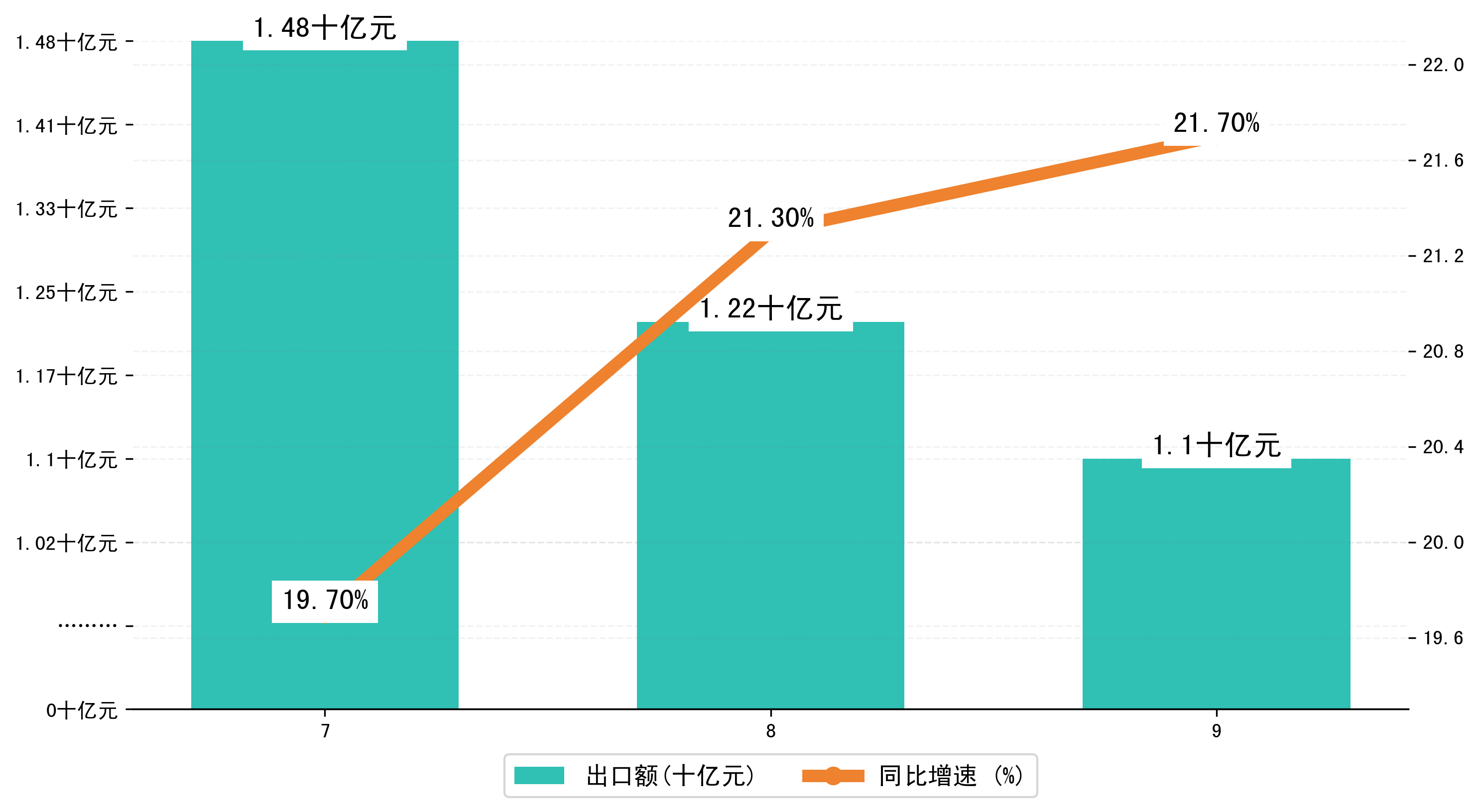 以人民币计,2025年9月鹰潭市出口额为10,9753.0159万元,相比上月减少了1,2614.091万元;相比上年同期增加了2,2817.6243万元,同比增加了21.70%。