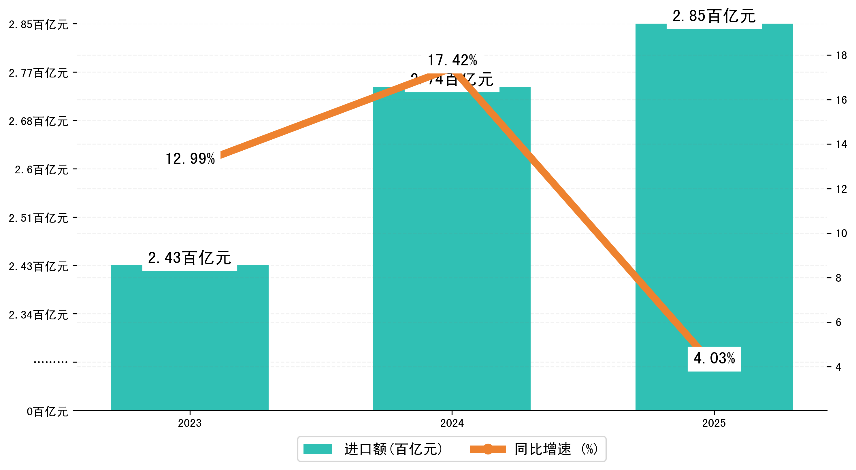 以人民币计,2025年1-9月鹰潭市进口额为285,0204.9896万元,相比上年同期增加了11,0428.426万元,同比增加了4.40%。