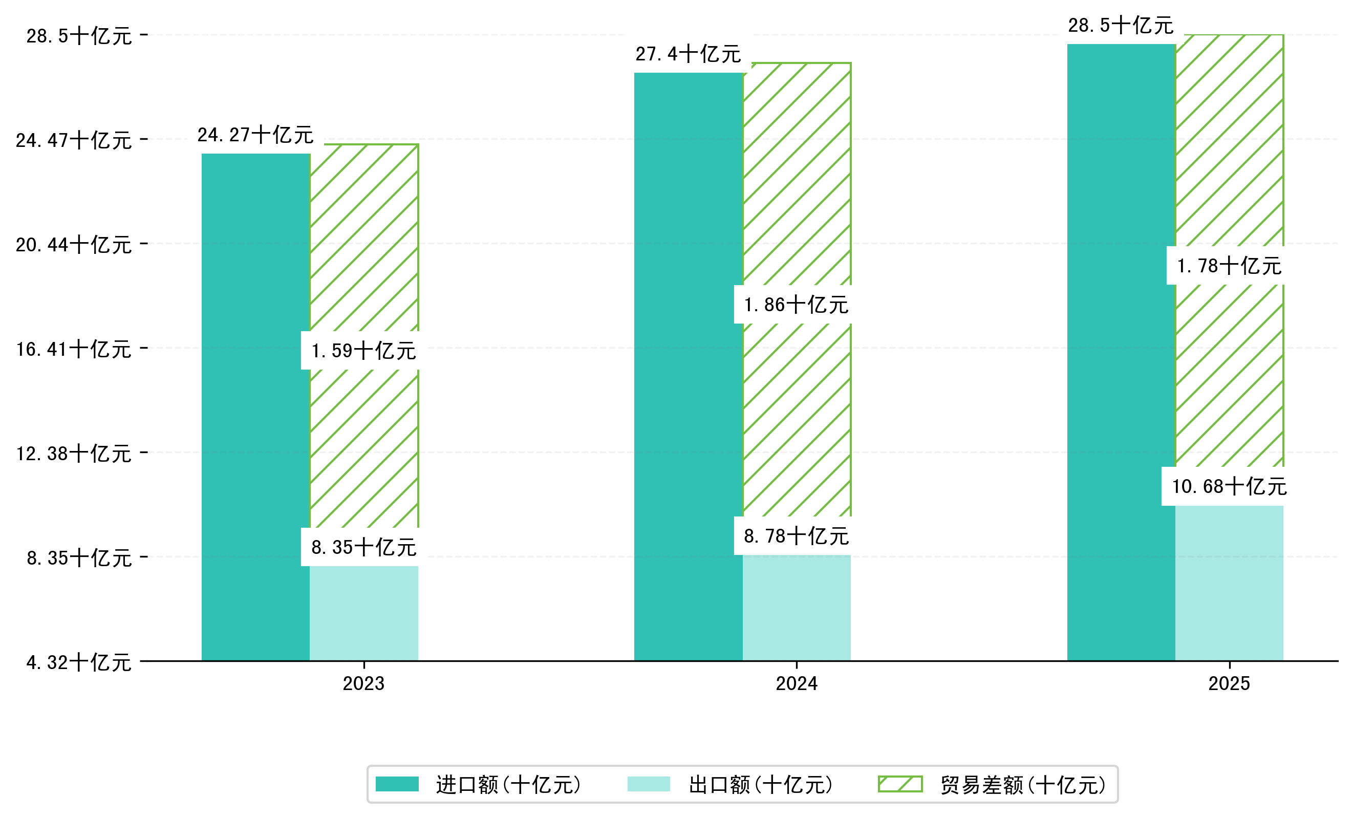 以人民币计,2025年1-9月鹰潭市贸易差额为178,1886,4810万元(贸易逆差),相比上年同期增加了8,0342,6294万元,同比增加-4.31%。