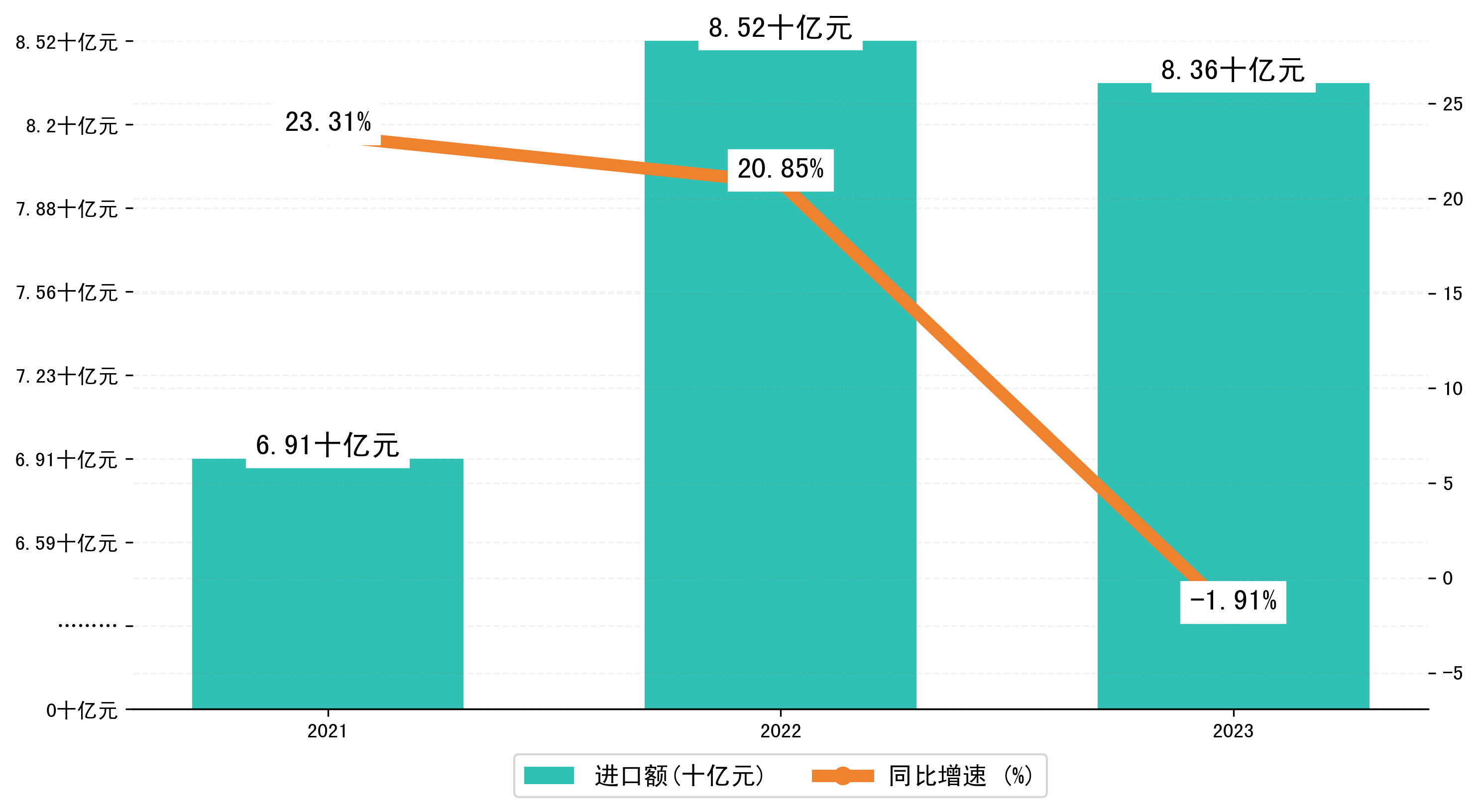 以人民币计,2023年1-3月鹰潭市进口额为83,5575.3758万元,相比上年同期减少了1,6236.978万元,同比减少了-3.20%。