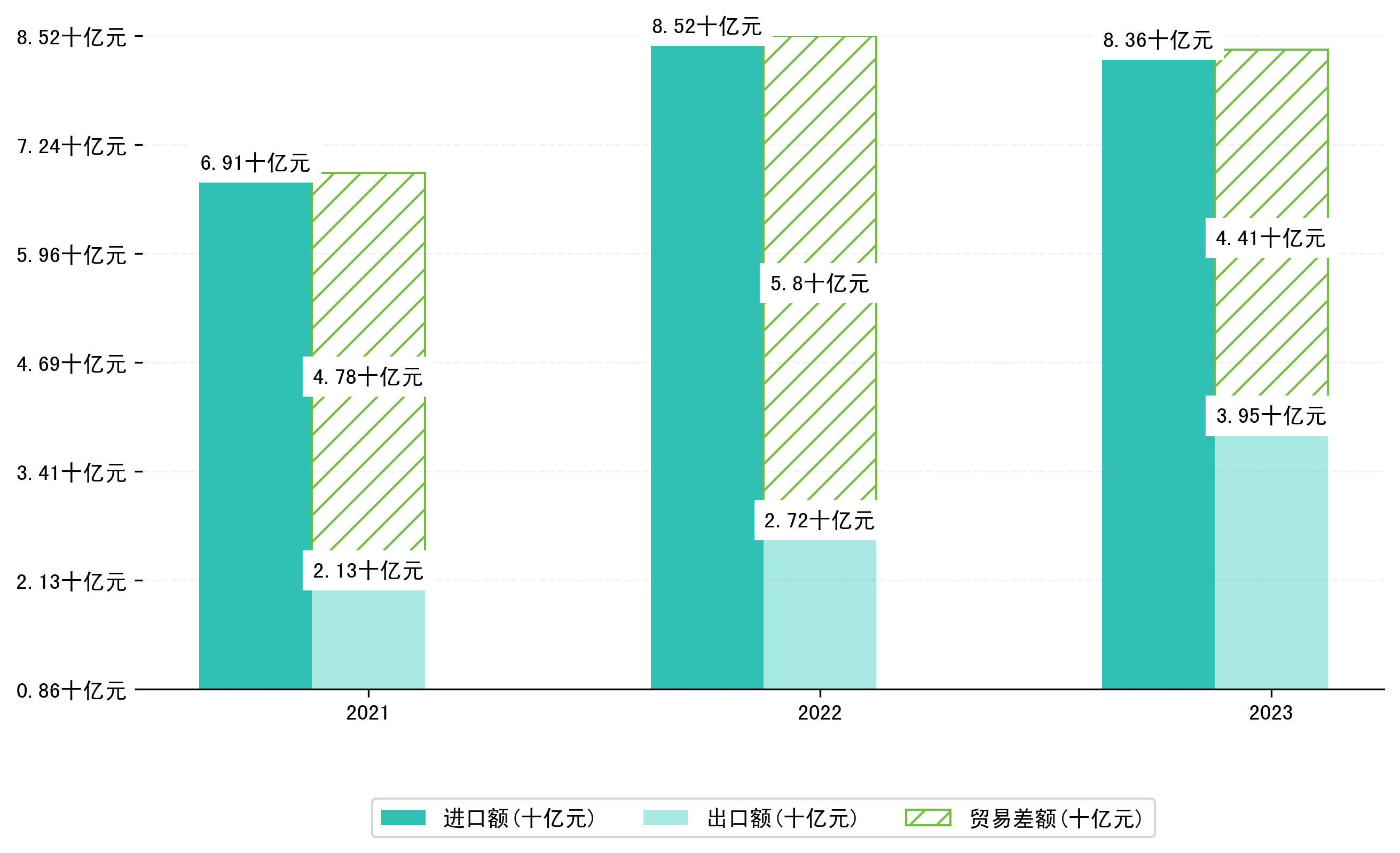 以美元计,2023年1-3月鹰潭市贸易差额为6,3990,3959万美元(贸易逆差),相比上年同期增加了2,7072,8947万美元,同比增加-29.73%。