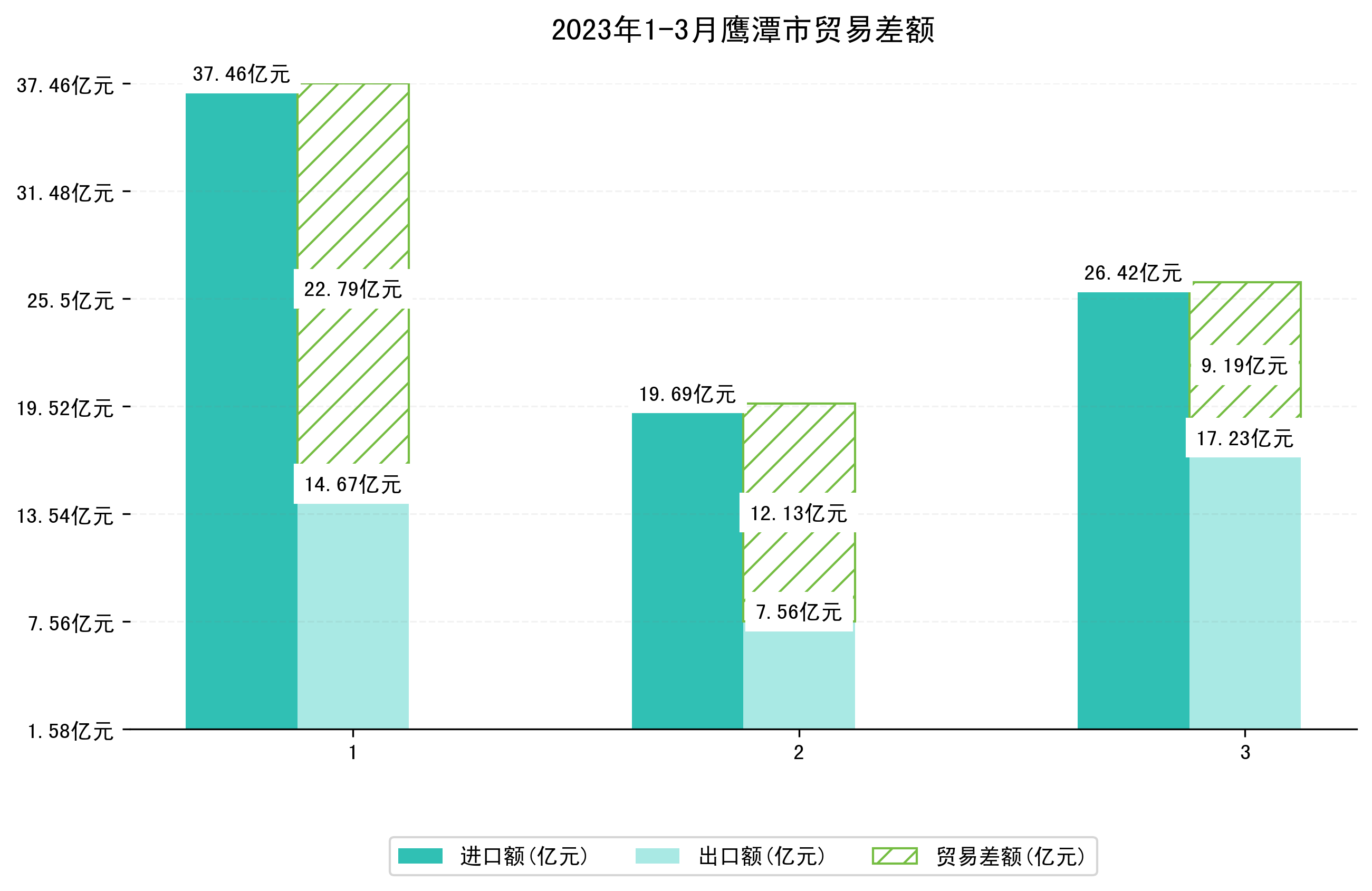 以人民币计,2023年1-3月鹰潭市进出口总额为123,0086.1706万元,相比上年同期增加了10,6389.8256万元,同比增加了8.40%。