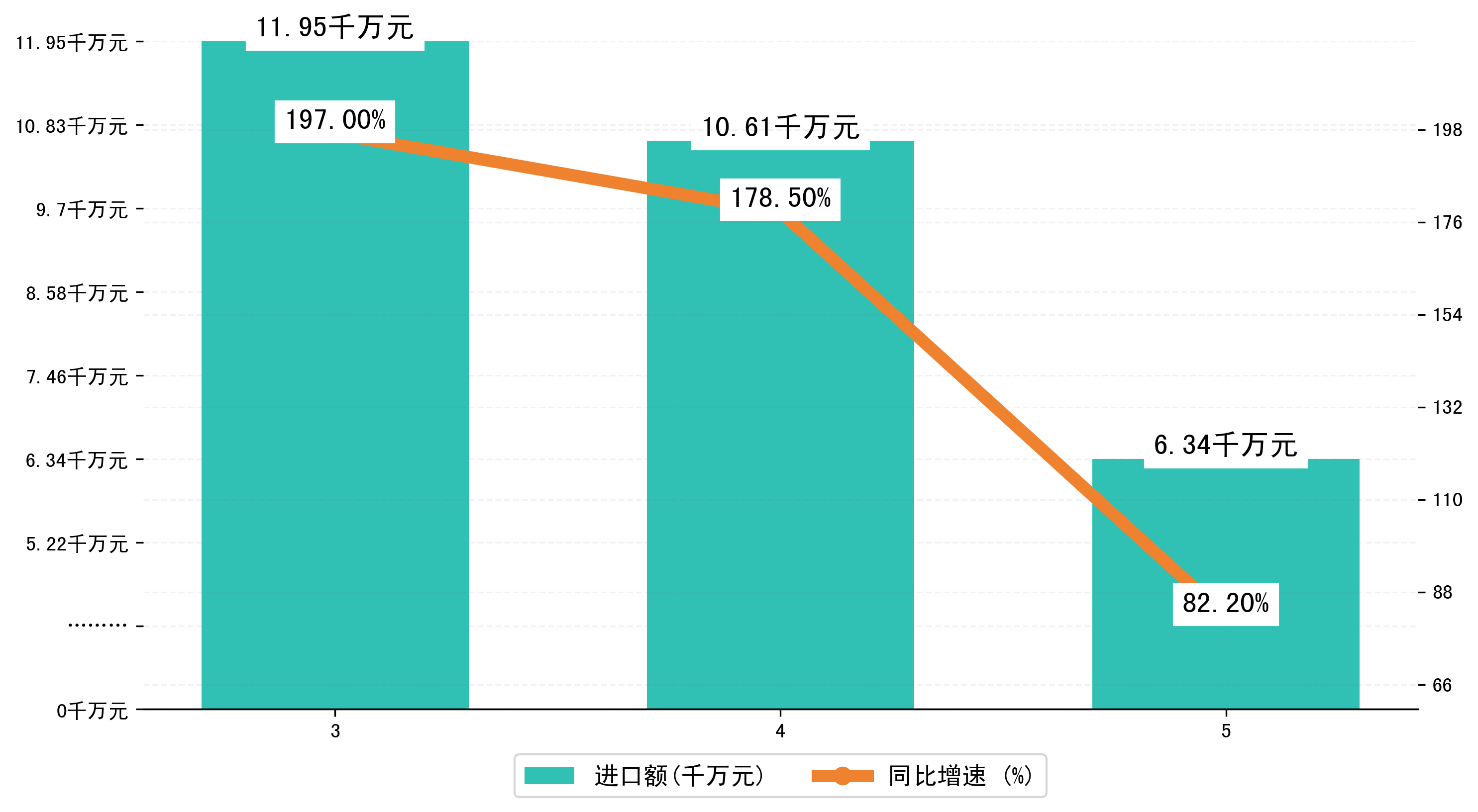 以人民币计,2023年5月益阳市进口额为6339.7448万元,相比上月减少了4268.3605万元;相比上年同期减少了6282.1261万元,同比增加了82.20%。