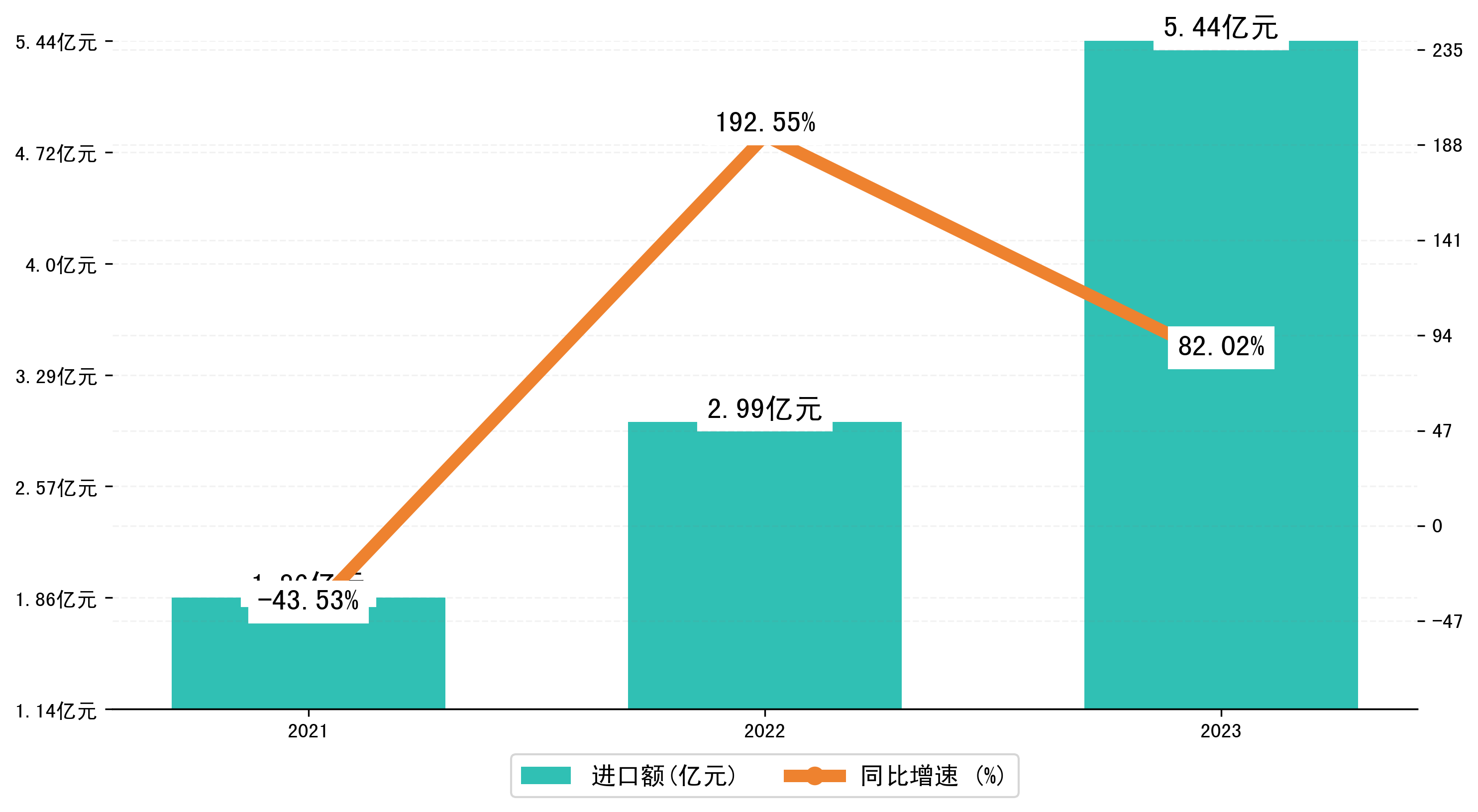 以美元计,2023年1-5月益阳市进口额为7910.8442万美元,相比上年同期增加了3241.4438万美元,同比增加69.60%。