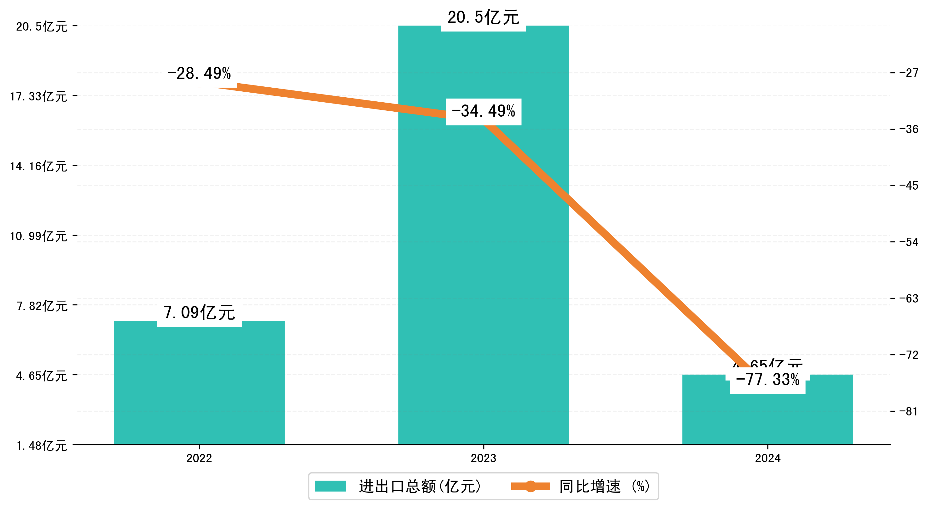 以人民币计,2024年1-1月益阳市进出口总额为4,6476.1848万元,相比上年同期减少了15,8568.5667万元,同比减少了-77.30%。