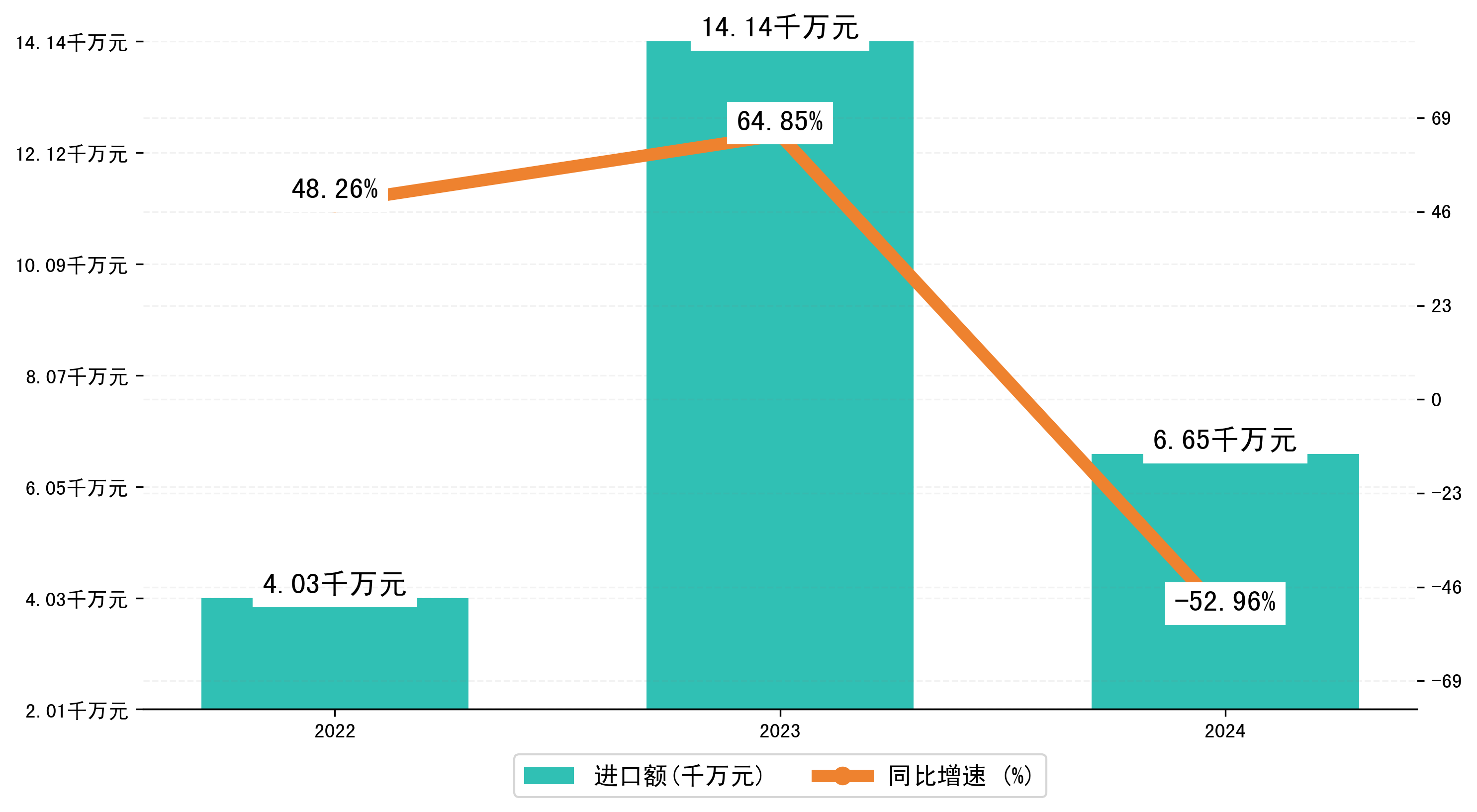 以人民币计,2024年1月益阳市进口额为6649.0481万元,相比上月减少了6676.5955万元;相比上年同期减少了7486.5146万元,同比减少了-53.20%。
