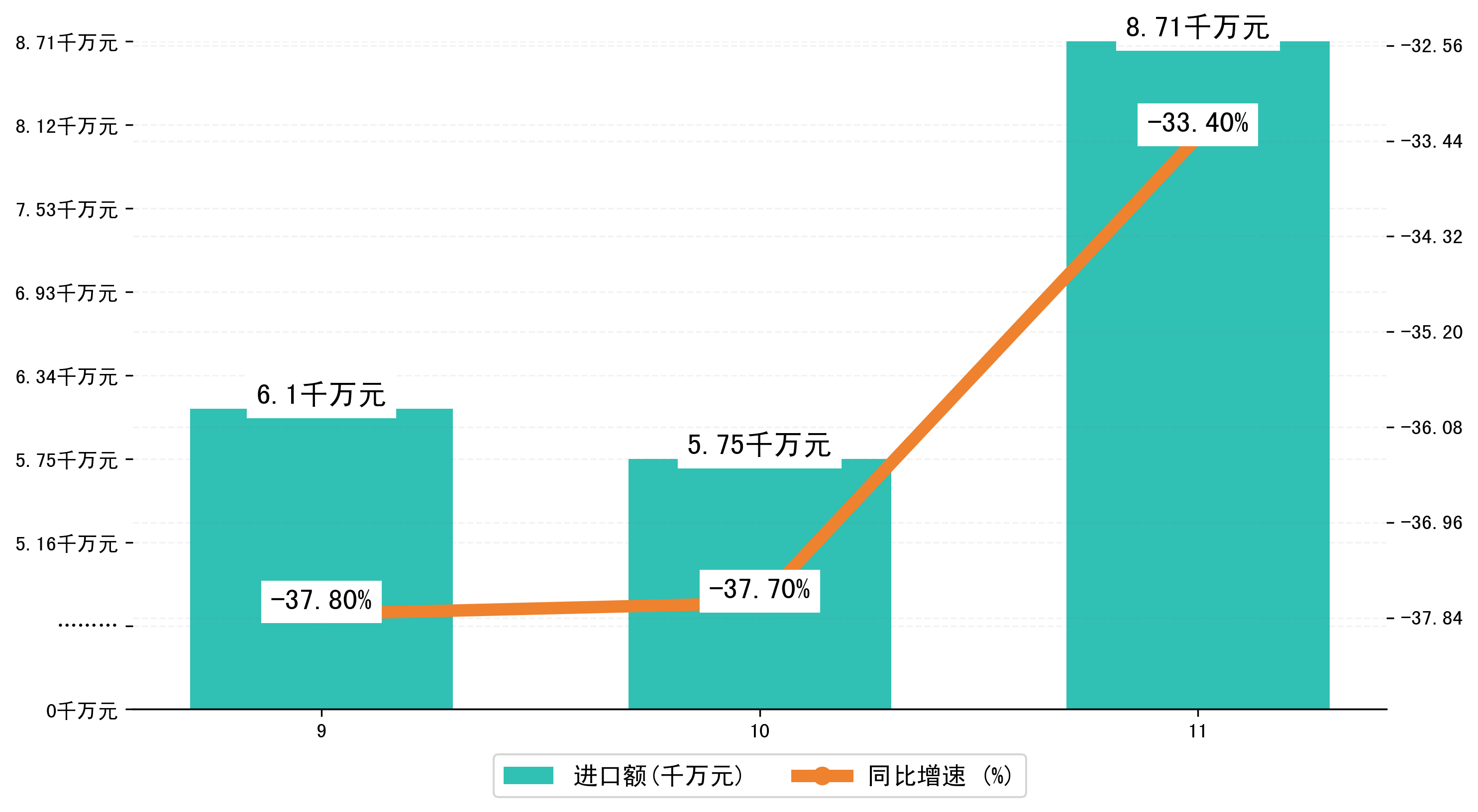 以人民币计,2024年11月益阳市进口额为8712.4491万元,相比上月增加了2962.9392万元;相比上年同期增加了1541.9979万元,同比减少了-33.40%。