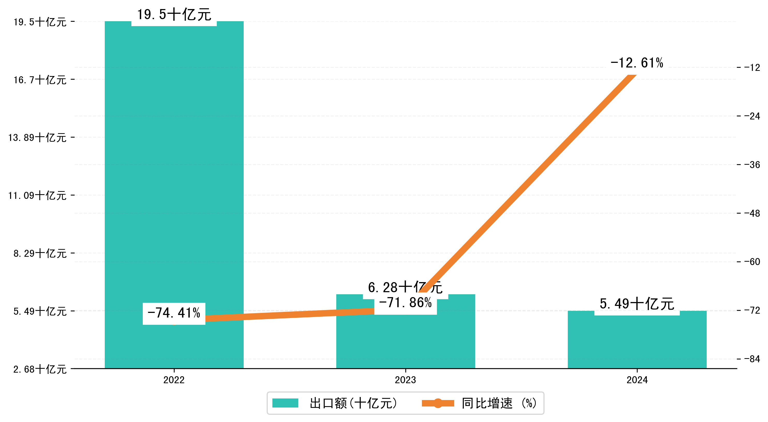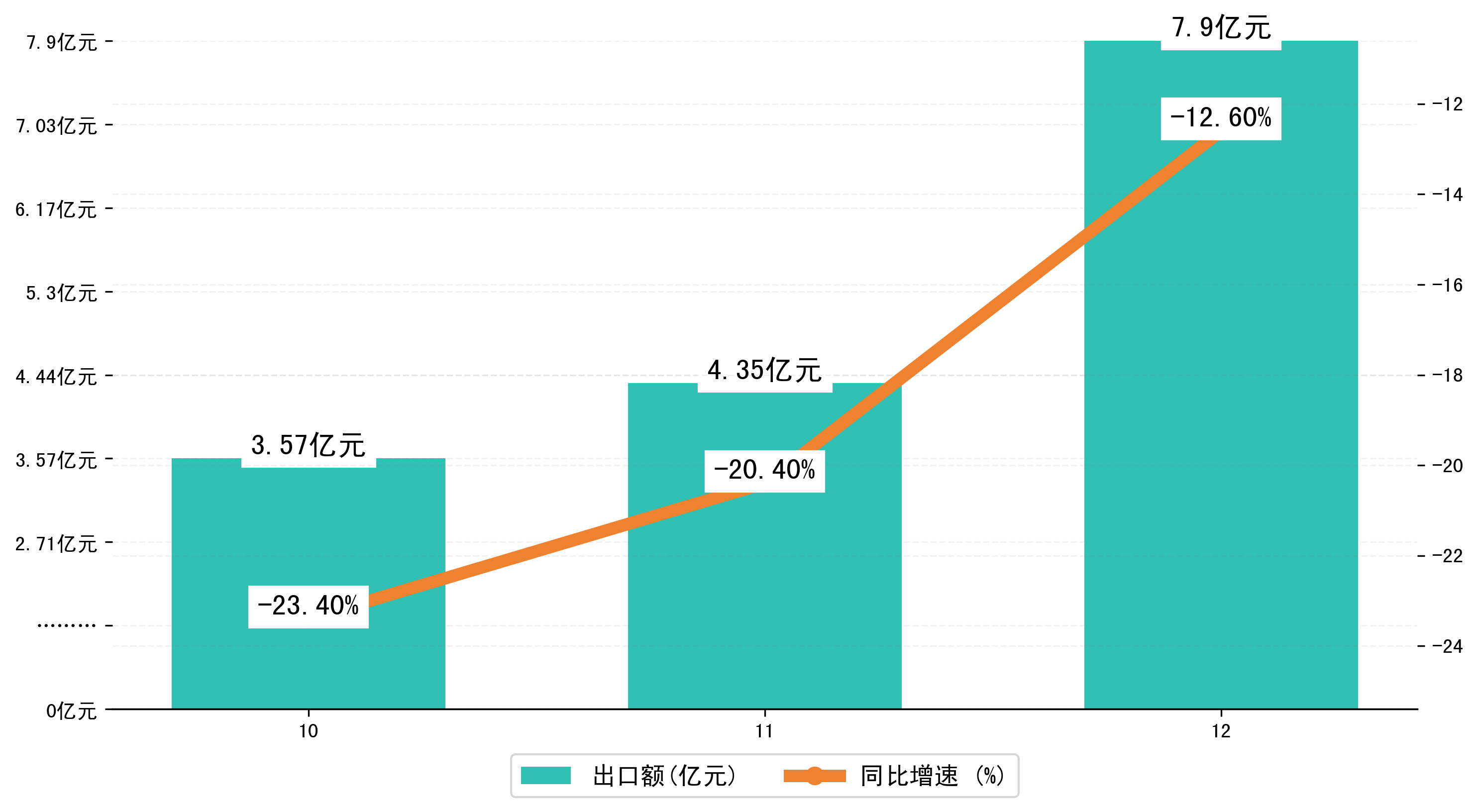 以人民币计,2024年1-12月益阳市出口额为54,8653.4126万元,相比上年同期减少了7,9162.9341万元,同比减少了-12.60%。