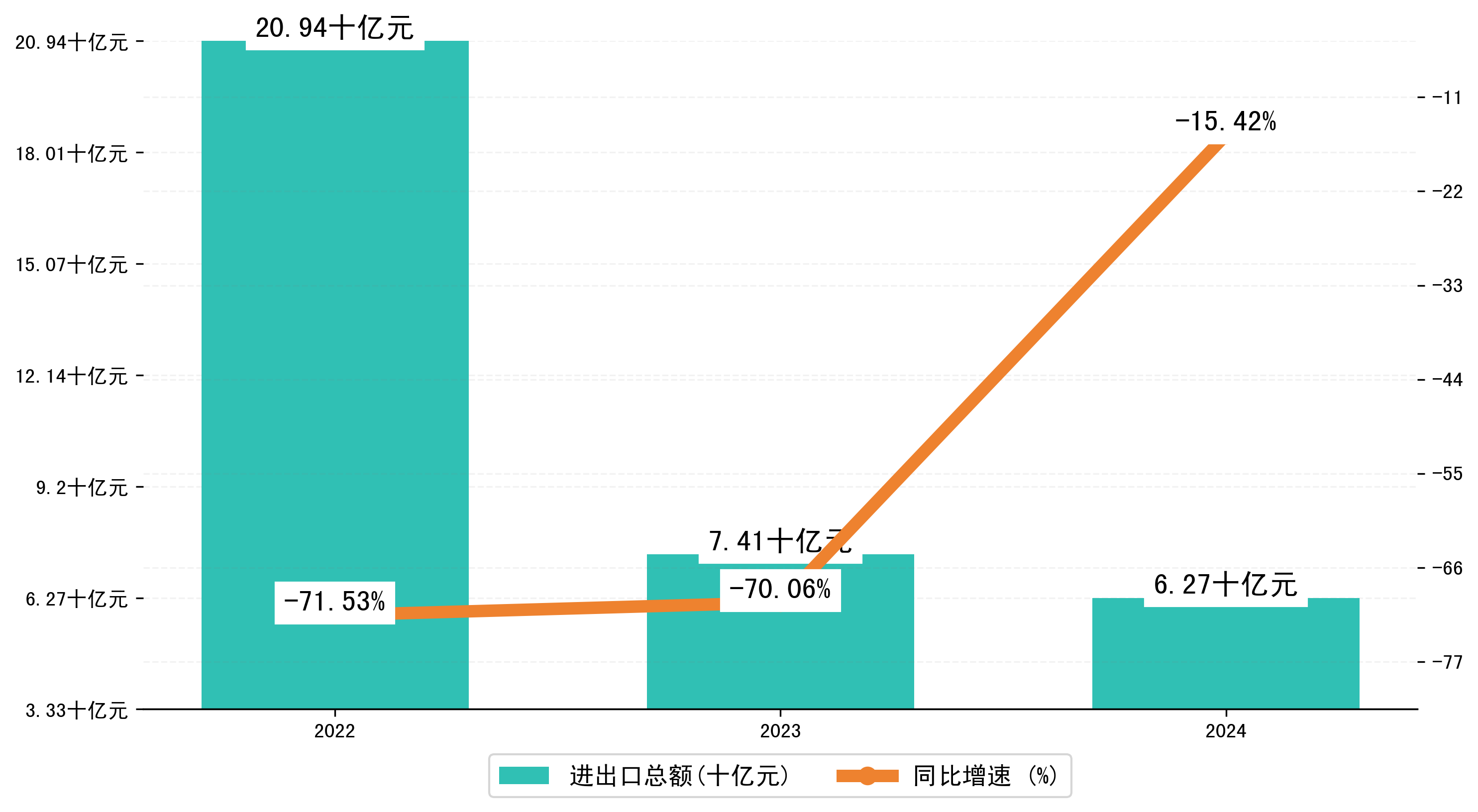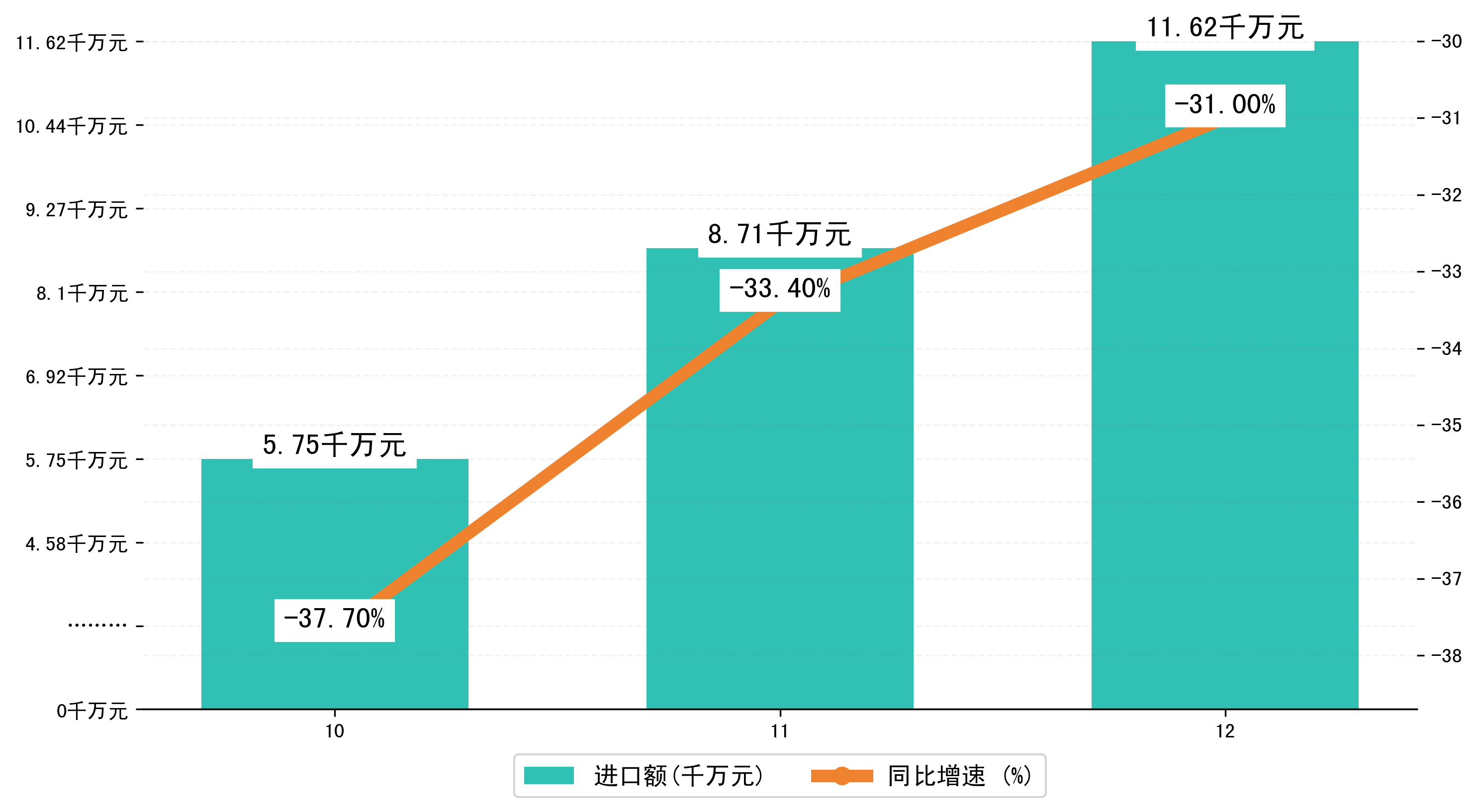 以人民币计,2024年1-12月益阳市进口额为7,8194.4822万元,相比上年同期减少了3,5121.2496万元,同比减少了-31.00%。