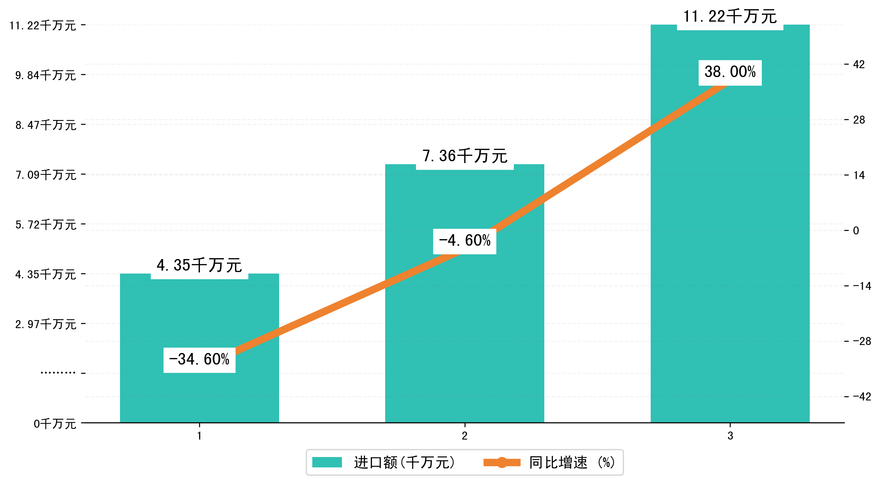 以人民币计,2025年3月益阳市进口额为1,1216.1582万元,相比上月增加了3852.352万元;相比上年同期增加了6867.7031万元,同比增加了38.00%。