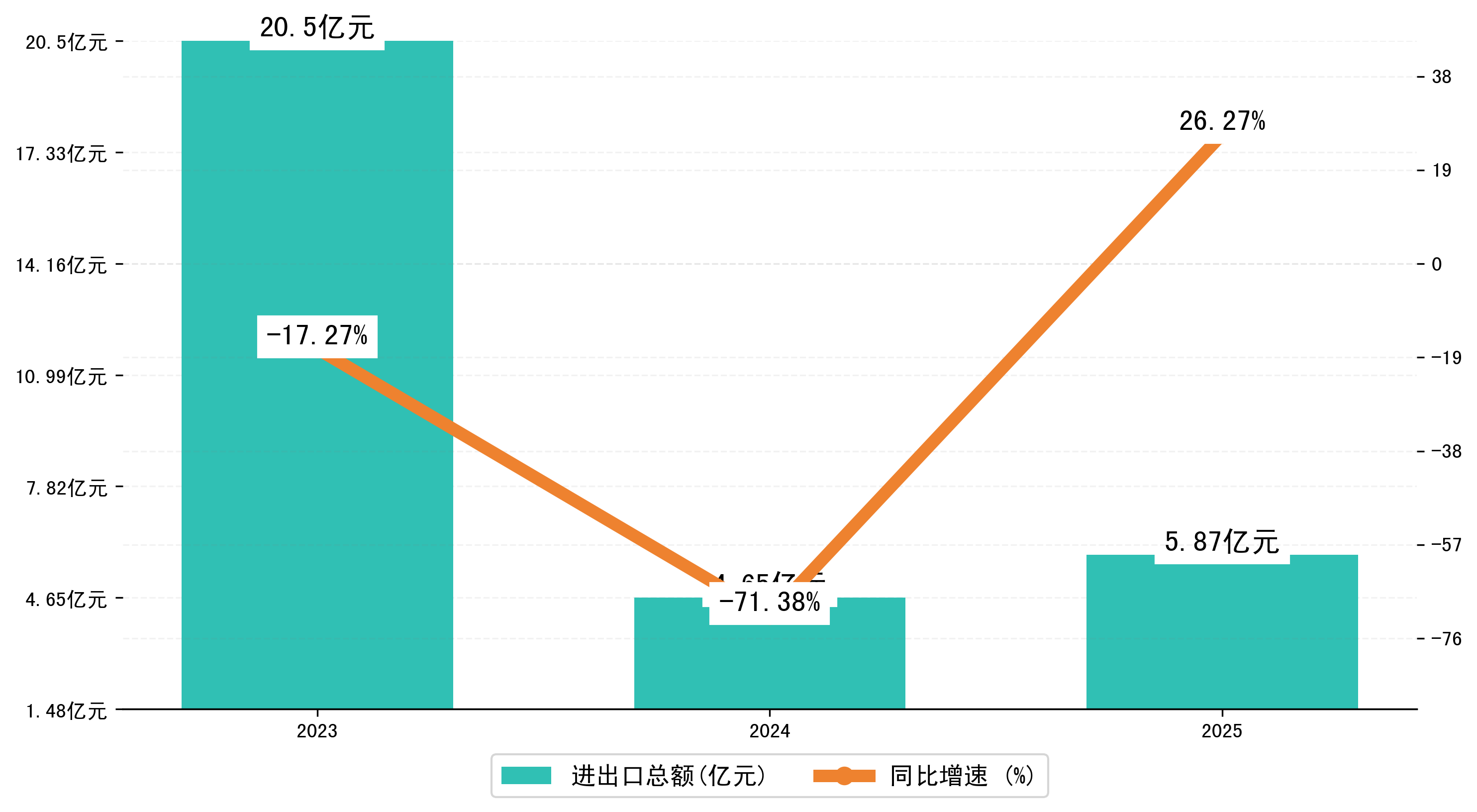 以美元计,2025年1-1月益阳市进出口总额为8163.5852万美元,相比上年同期增加了1619.5126万美元,同比增加24.70%。