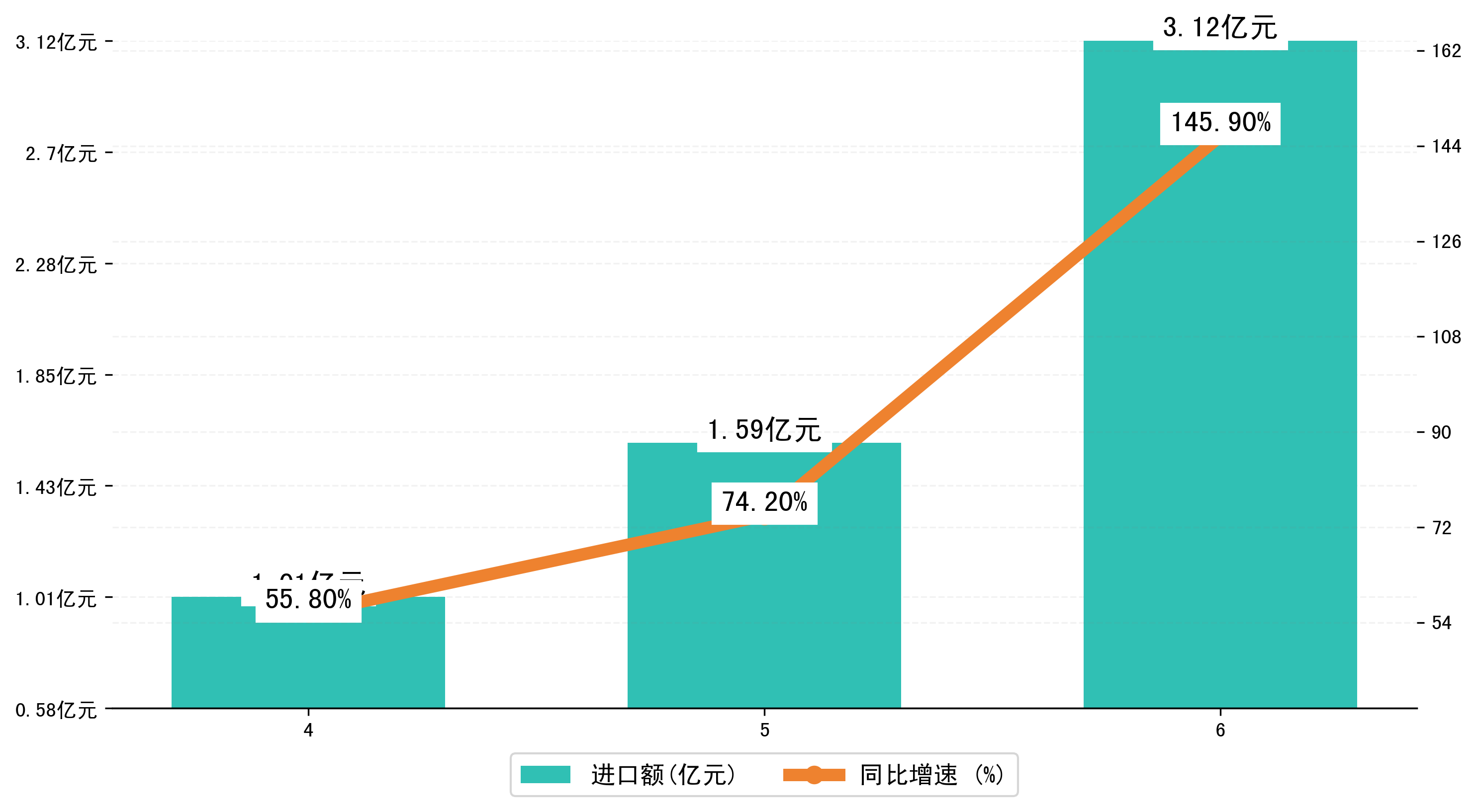 以人民币计,2025年6月益阳市进口额为3,1212.1453万元,相比上月增加了1,5281.8413万元;相比上年同期增加了2,6700.8425万元,同比增加了145.90%。