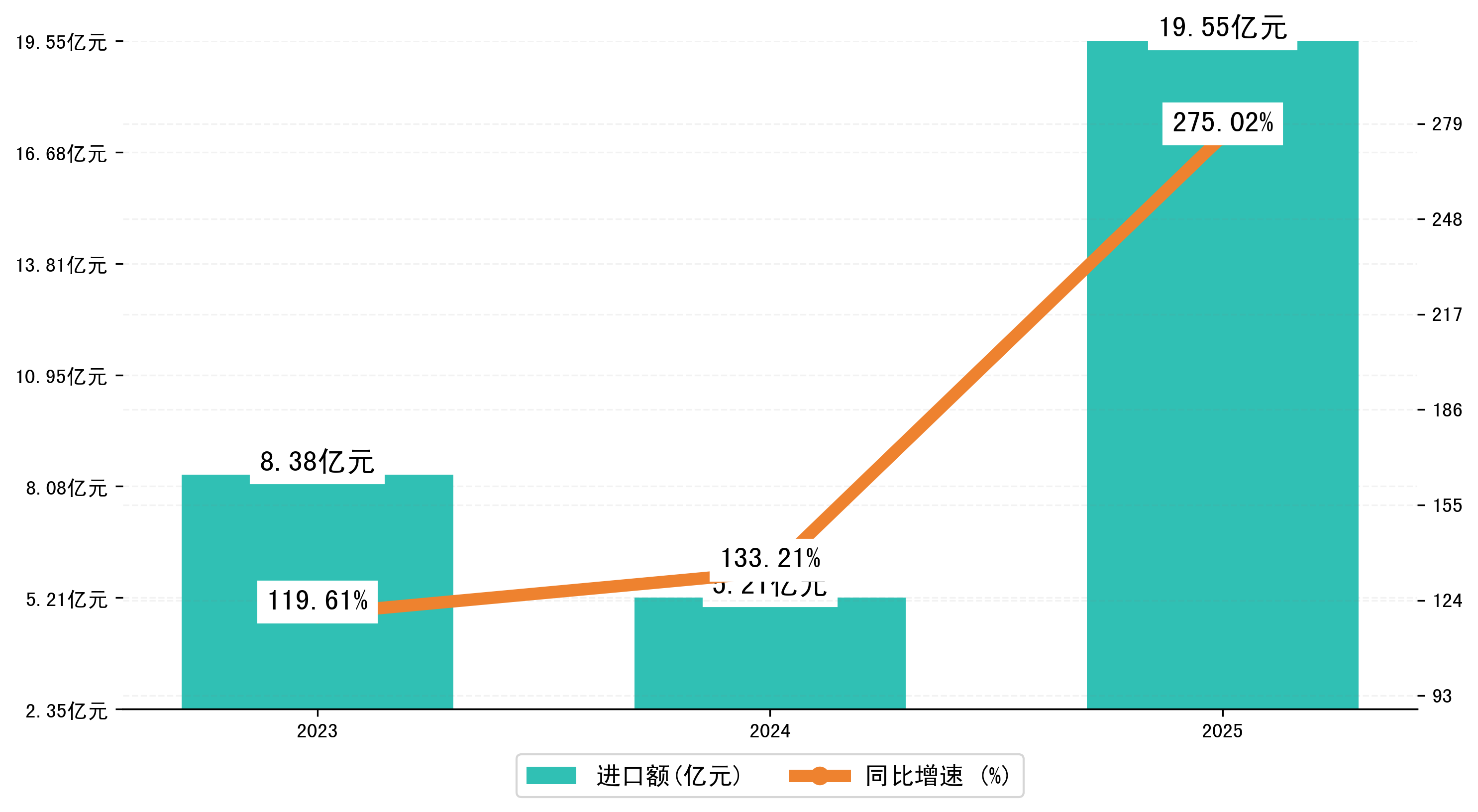 以人民币计,2025年1-9月益阳市进口额为19,5470.3483万元,相比上年同期增加了14,3348.2524万元,同比增加了275.10%。