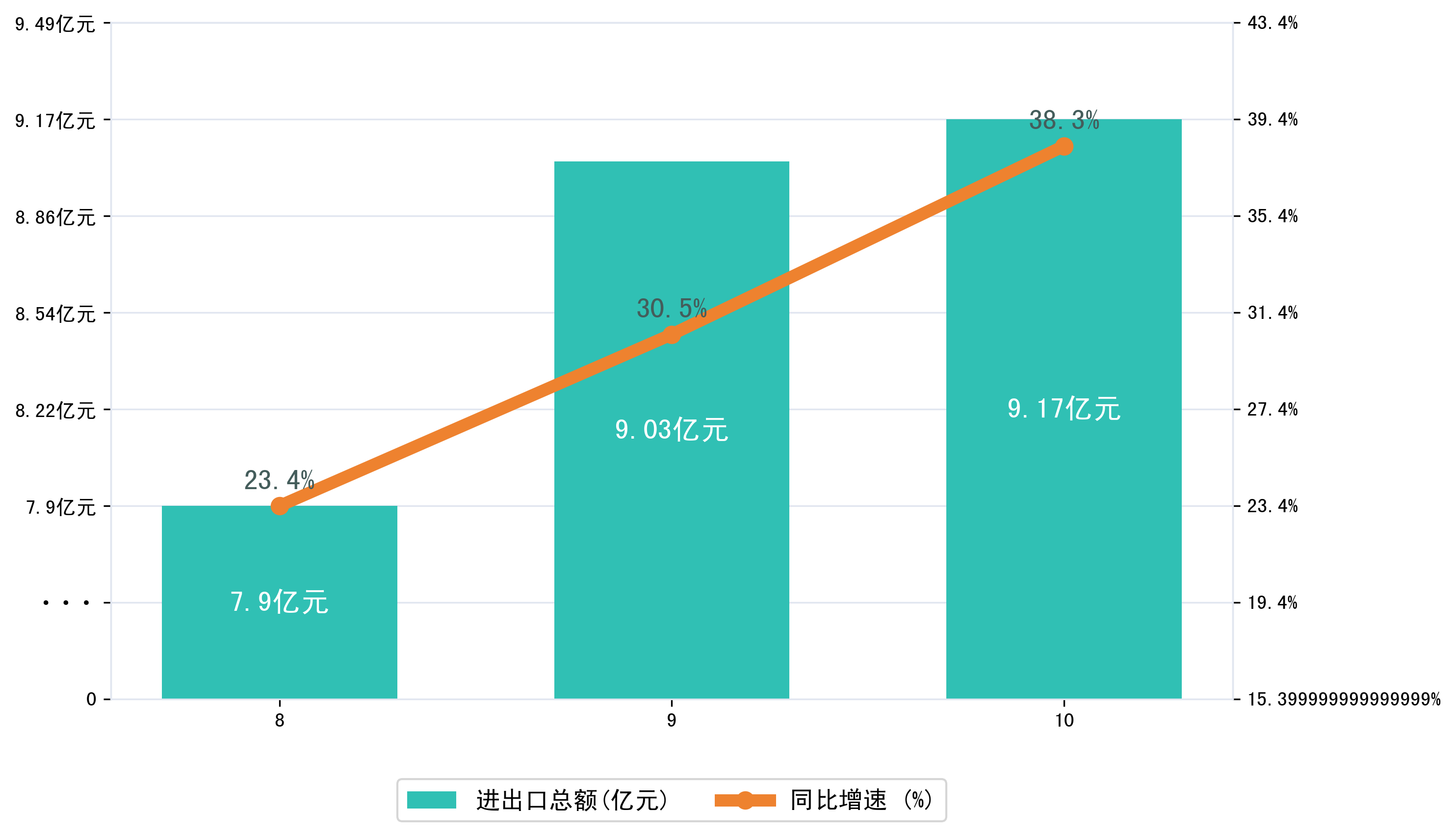以人民币计,2025年10月益阳市进出口总额为9,1729.4108万元,相比上月增加了1380.0125万元;相比上年同期增加了5,0255.947万元,同比增加了38.30%。