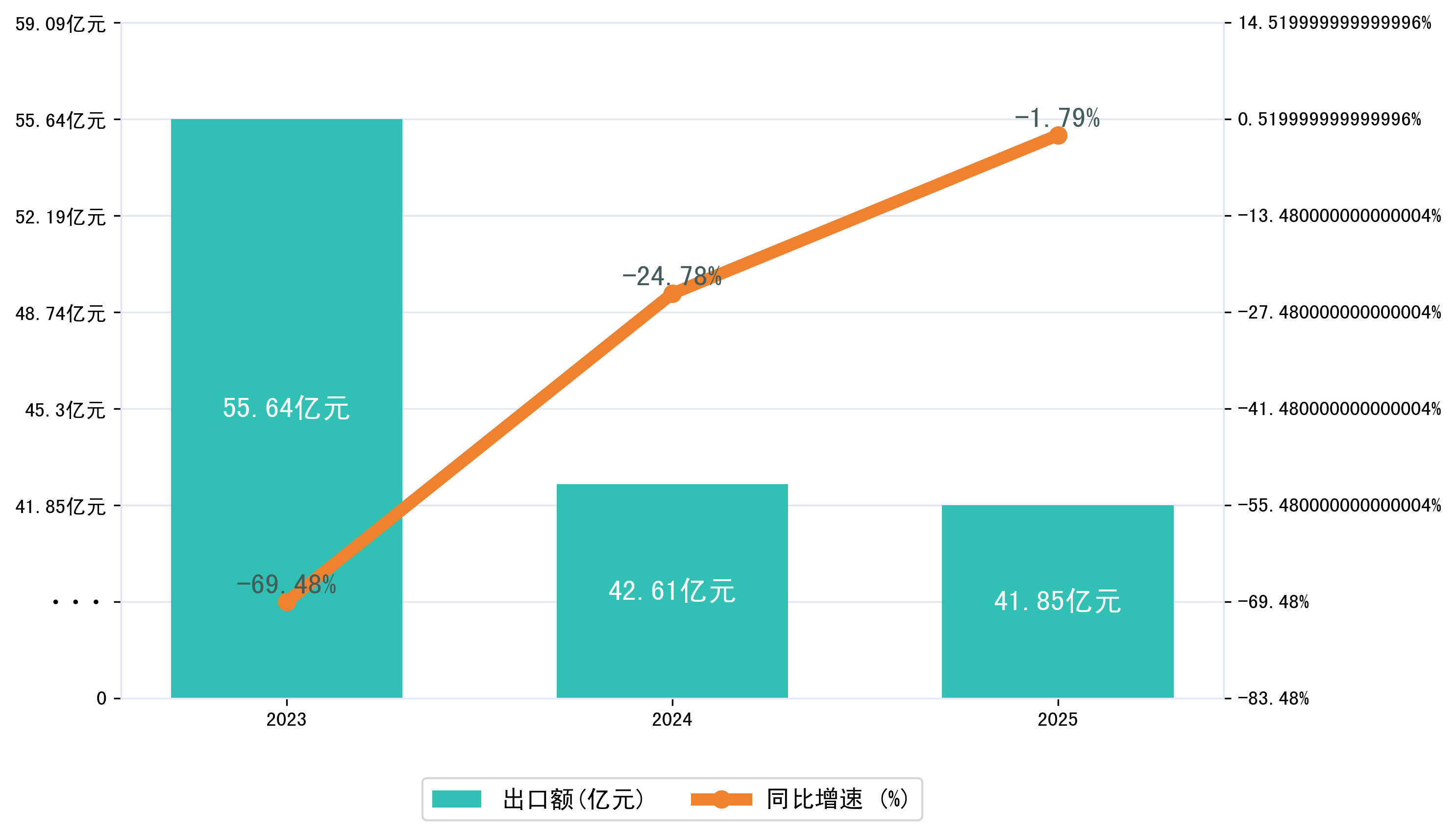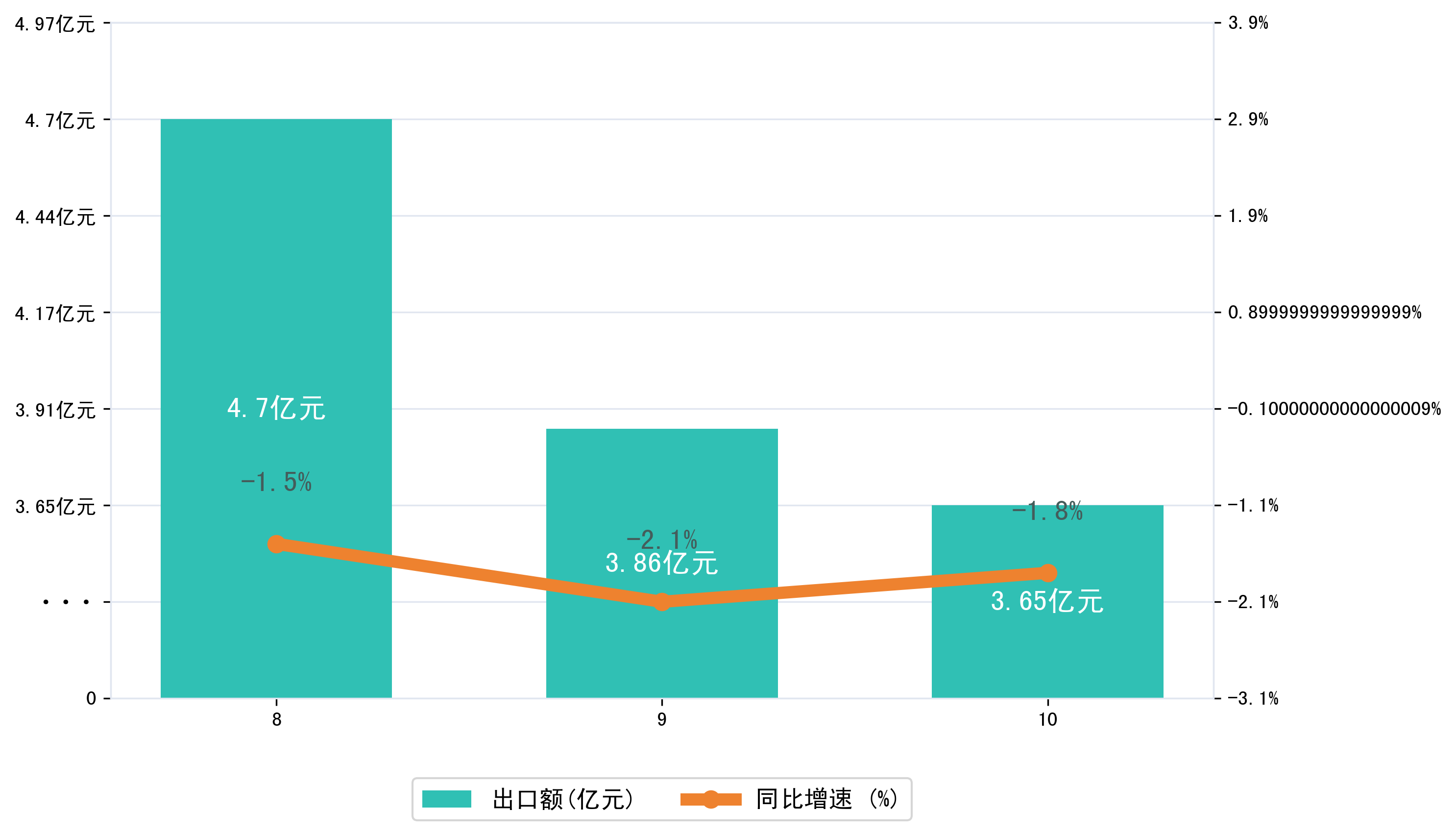 以美元计,2025年1-10月益阳市出口额为5,8364.7277万美元,相比上年同期减少了1580.2058万美元,同比减少-2.60%。