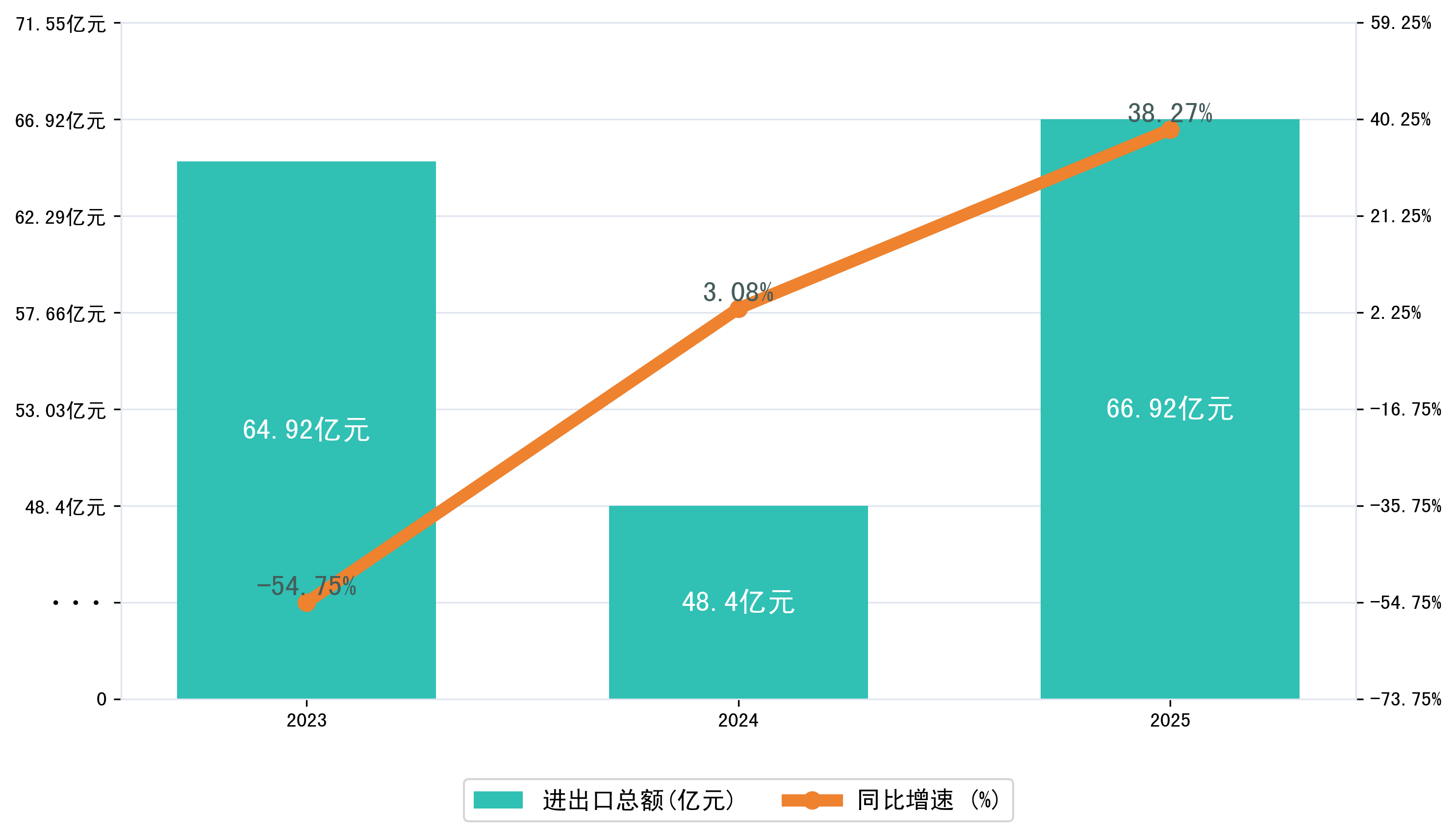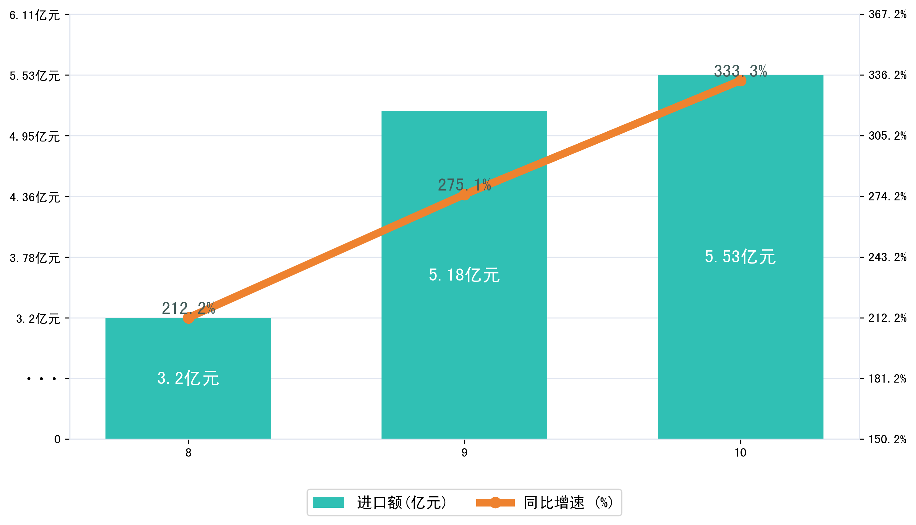 以人民币计,2025年10月益阳市进口额为5,5261.5498万元,相比上月增加了3468.4586万元;相比上年同期增加了4,9512.0399万元,同比增加了333.30%。