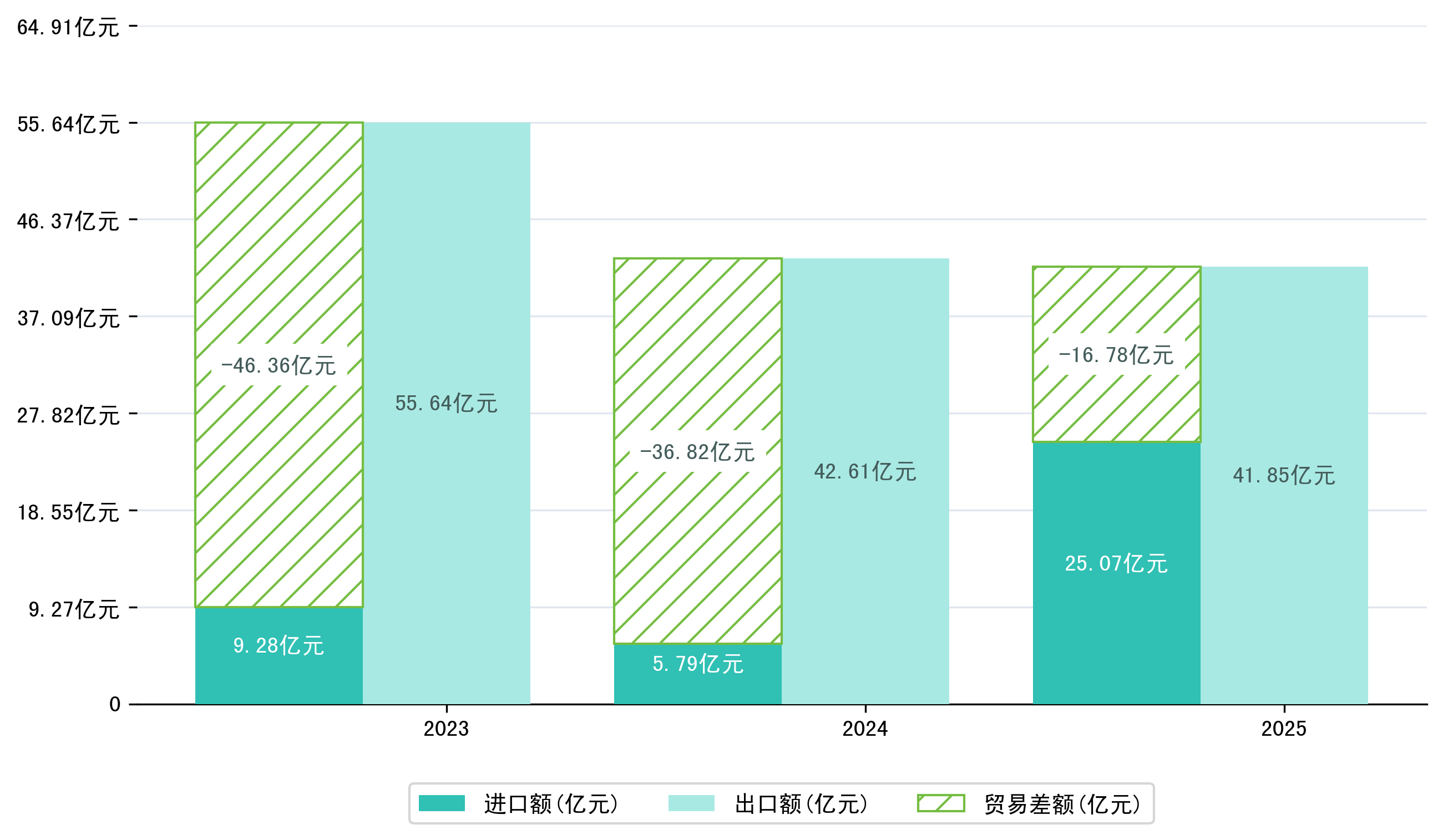 以人民币计,2025年1-10月益阳市贸易差额为16,7766,0269万元(贸易顺差),相比上年同期减少了20,0482,6963万元,同比减少-54.44%。