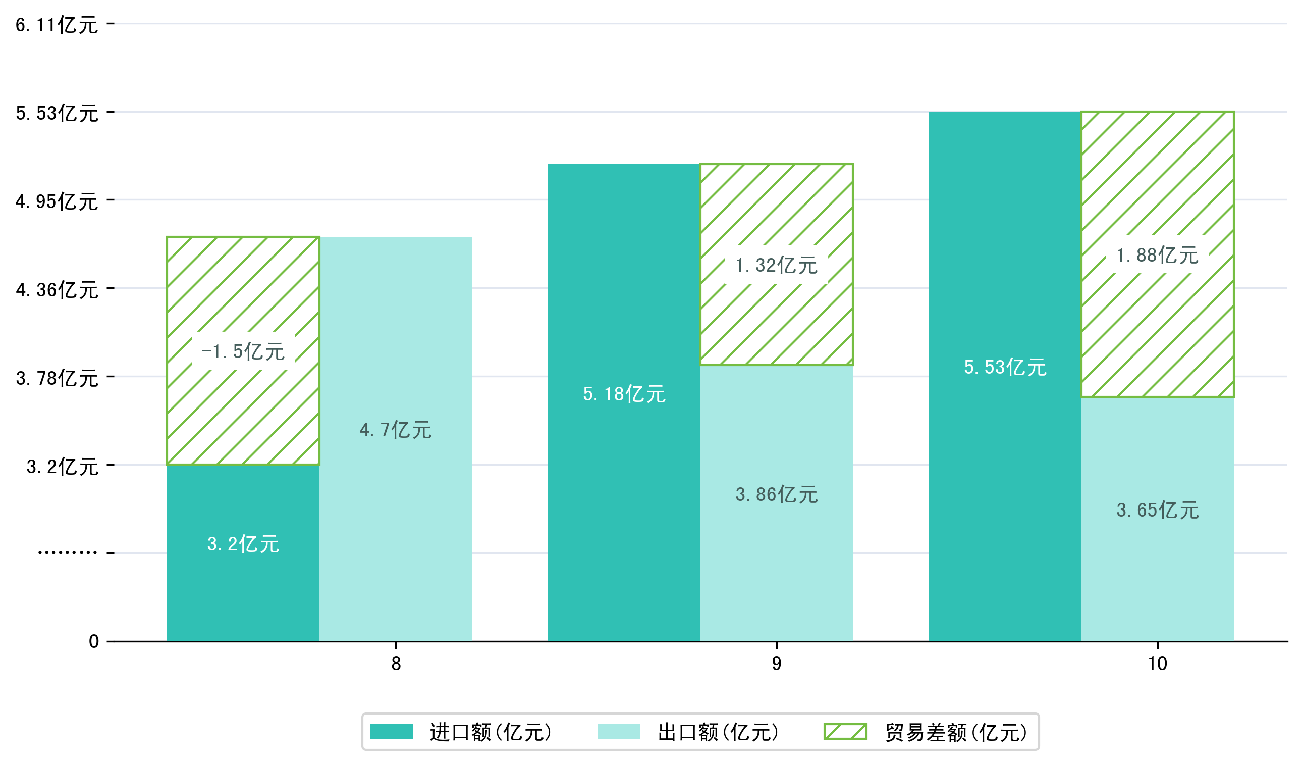 以人民币计,2025年10月益阳市贸易差额为1,8793,6888万元(贸易逆差),相比上月减少了5556,9047万元,即789,8112万美元;相比上年同期减少了4,8768,1328万元,同比减少-162.7%。