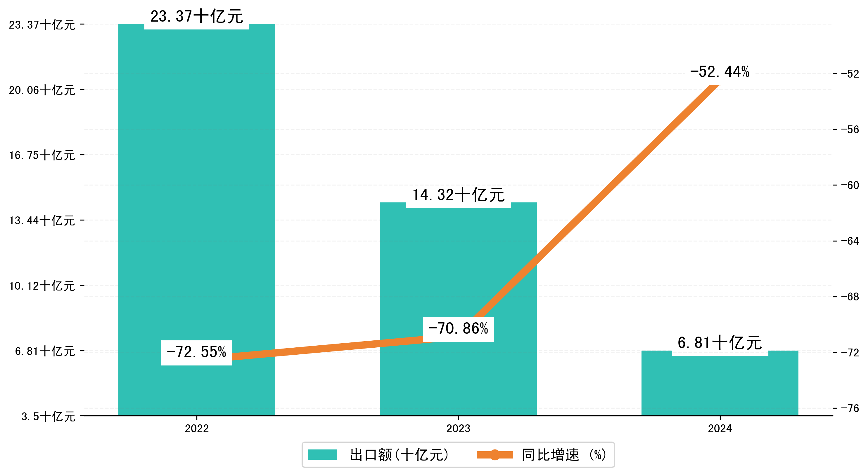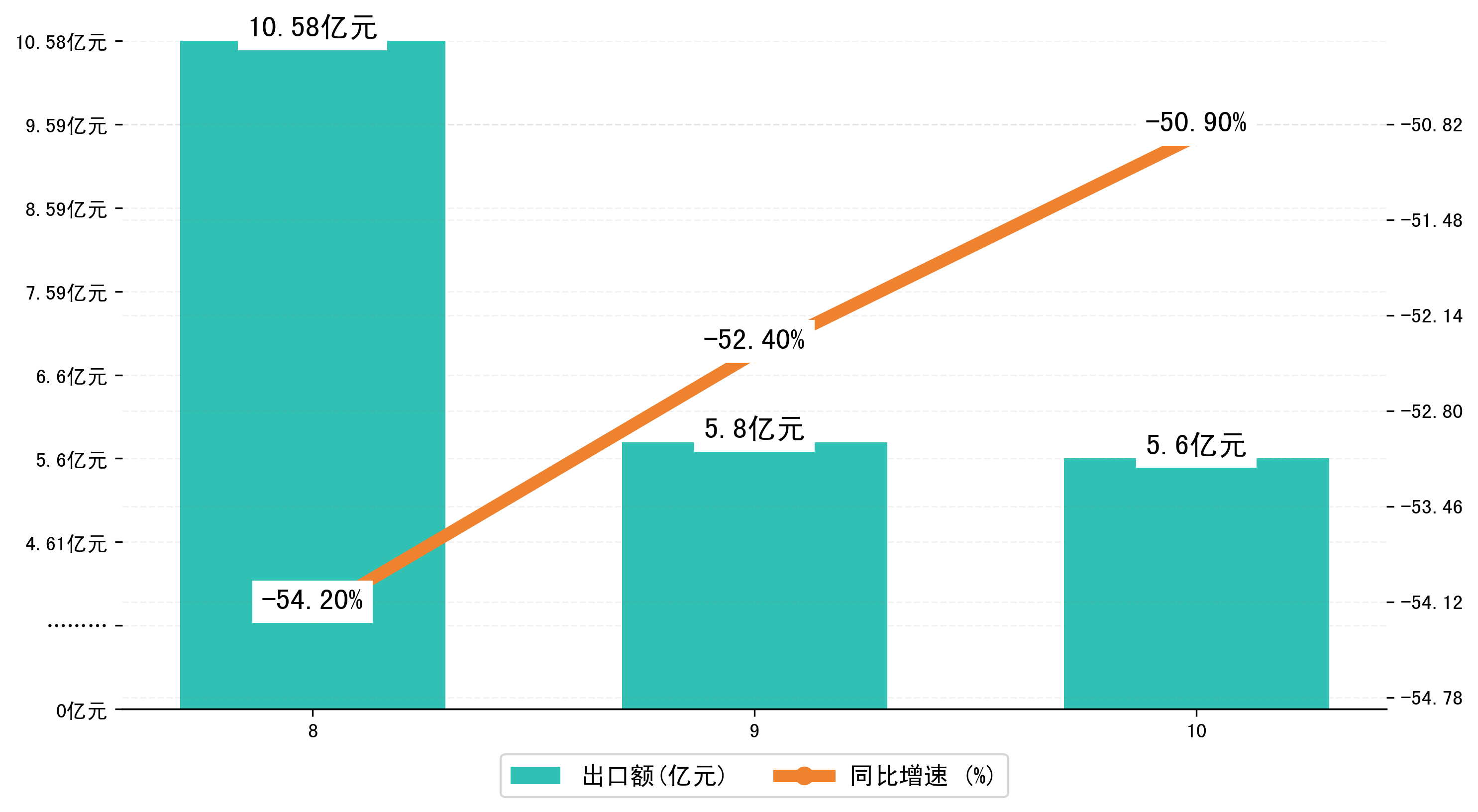以美元计,2024年1-10月岳阳市出口额为9,5775.6179万美元,相比上年同期减少了10,9812.9494万美元,同比减少-51.90%。