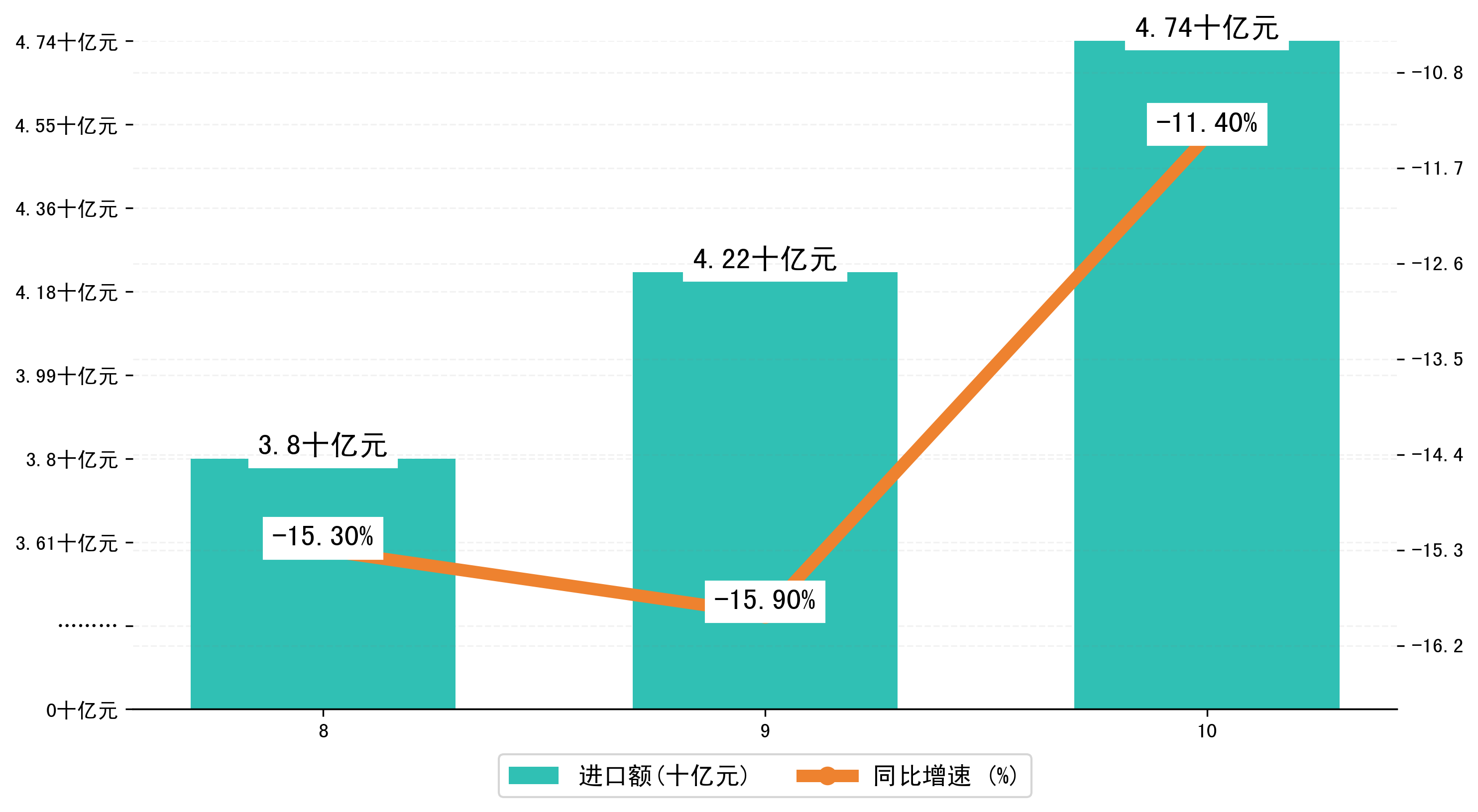以人民币计,2024年10月岳阳市进口额为47,3976.8345万元,相比上月增加了5,2098.9672万元;相比上年同期增加了14,3179.2489万元,同比减少了-11.40%。