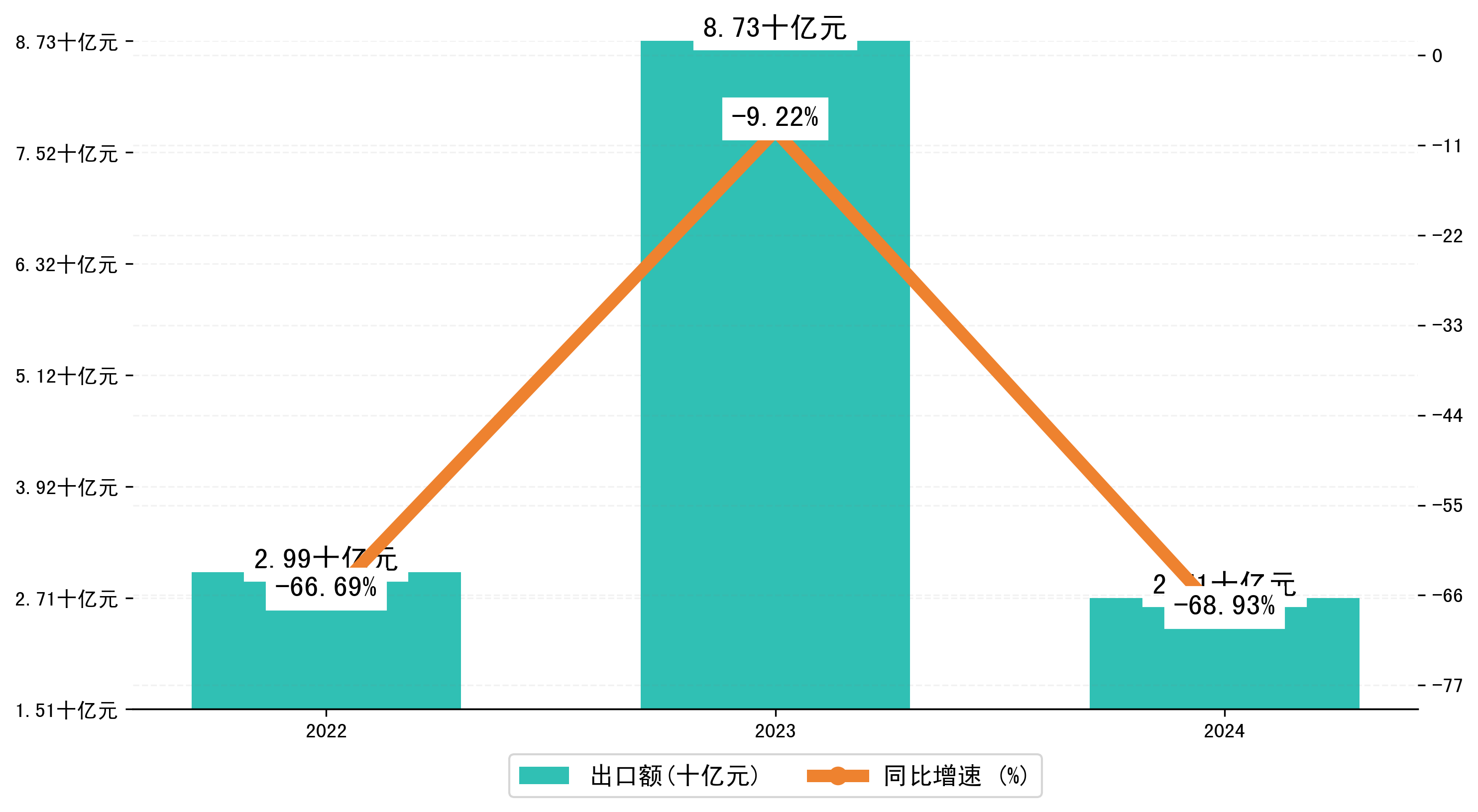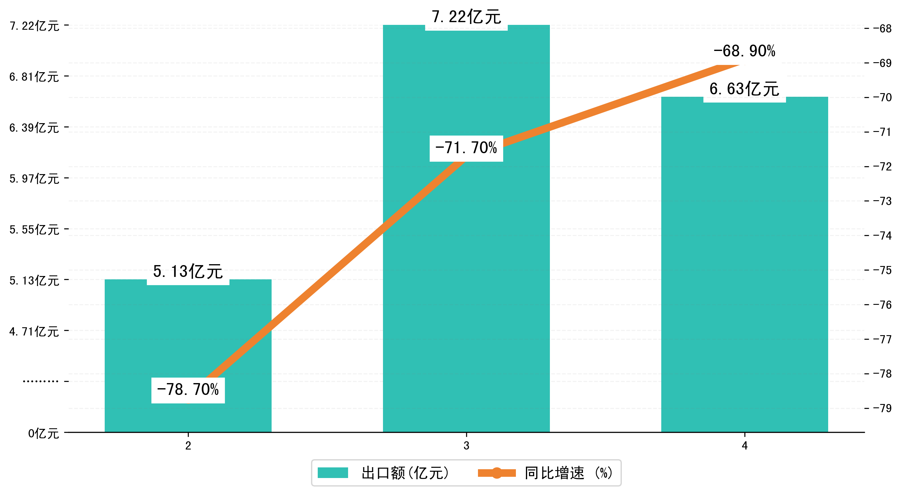 以美元计,2024年1-4月岳阳市出口额为3,8138.839万美元,相比上年同期减少了8,8406.9841万美元,同比减少-69.90%。