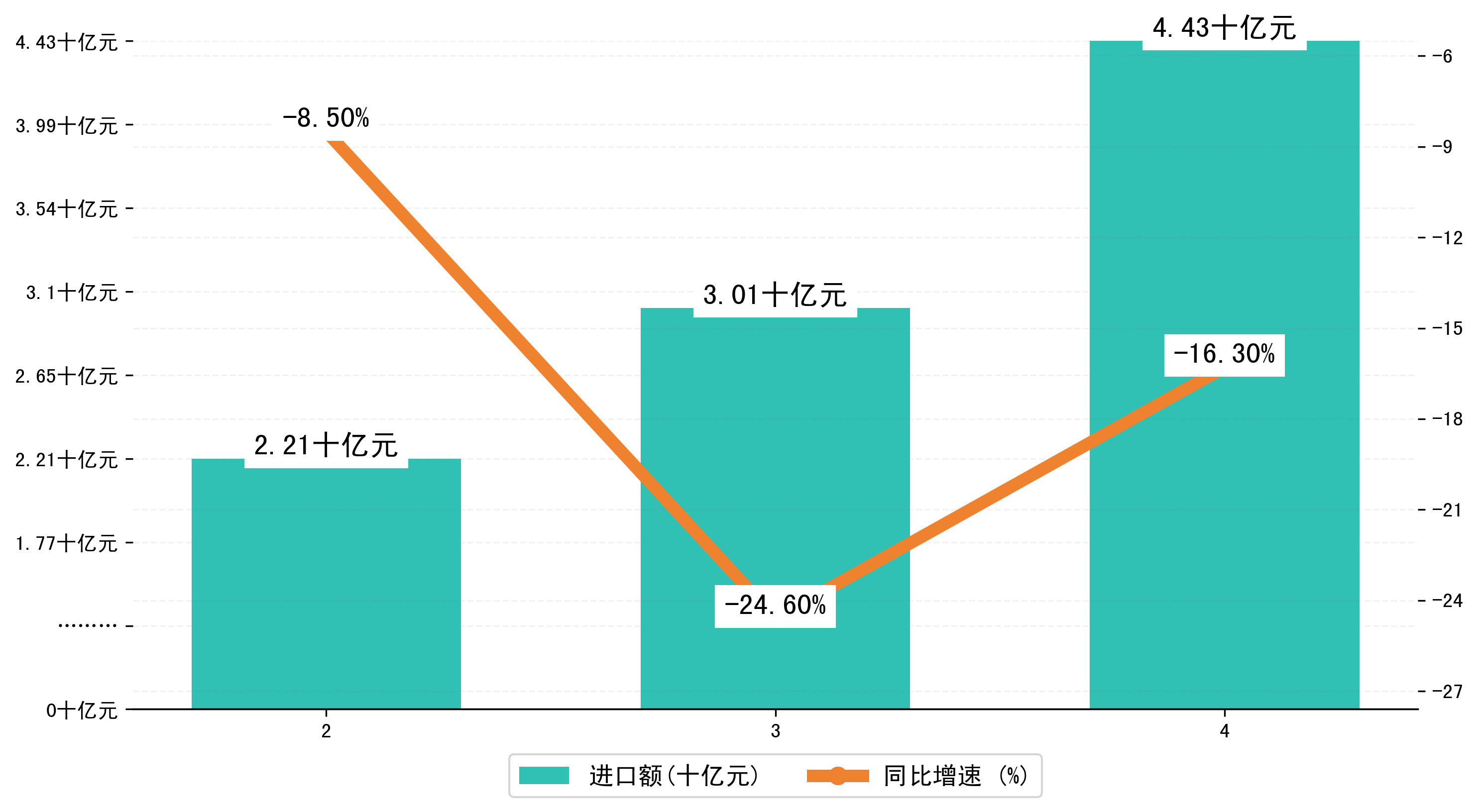 以人民币计,2024年4月岳阳市进口额为44,3188.661万元,相比上月增加了14,2202.6402万元;相比上年同期增加了3,4453.8347万元,同比减少了-16.30%。