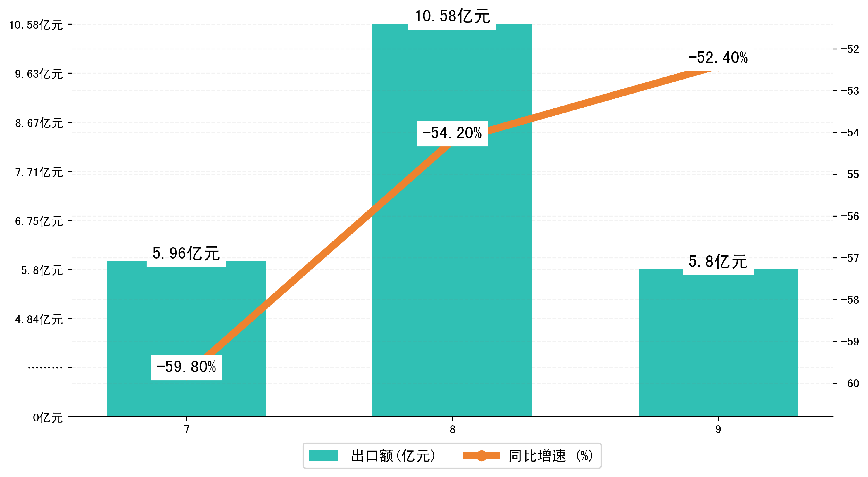以人民币计,2024年9月岳阳市出口额为5,7969.1686万元,相比上月减少了4,7851.9792万元;相比上年同期减少了1,0460.1133万元,同比减少了-52.40%。