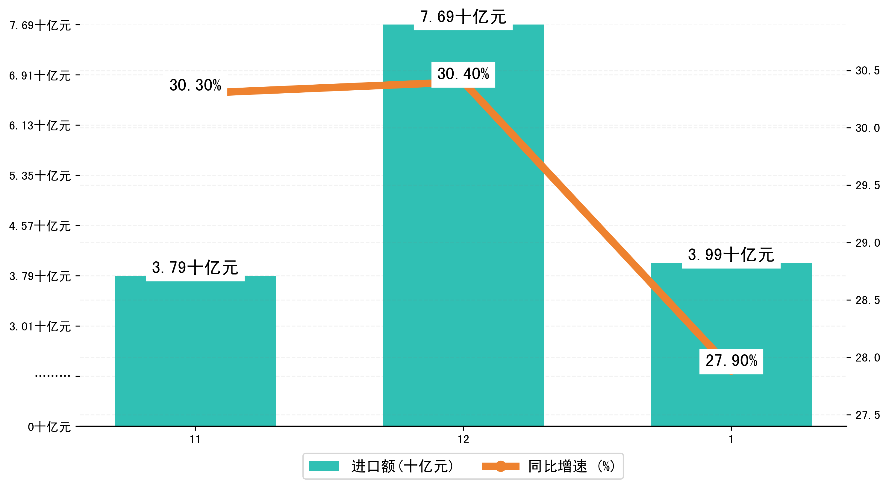以人民币计,2024年1月岳阳市进口额为39,9006.203万元,相比上月减少了36,9772.158万元;相比上年同期增加了8,6932.3605万元,同比增加了27.90%。
