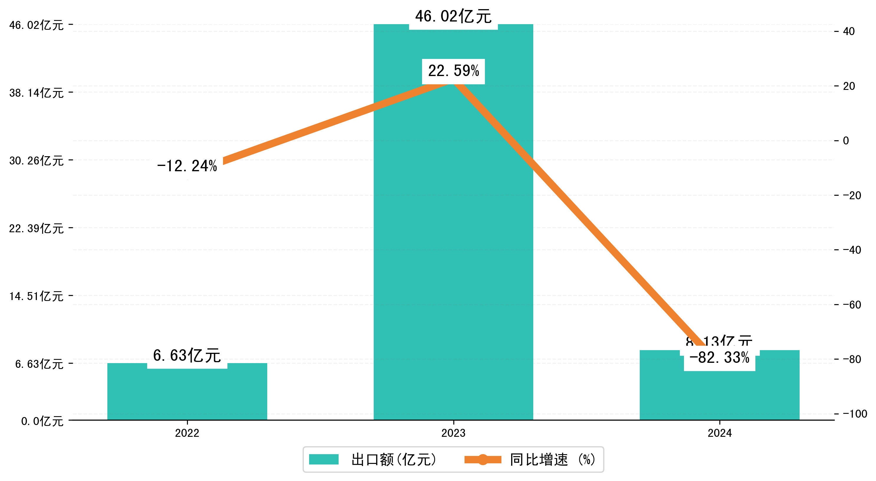 以人民币计,2024年1-1月岳阳市出口额为8,1302.6881万元,相比上年同期减少了37,8877.1857万元,同比减少了-82.30%。